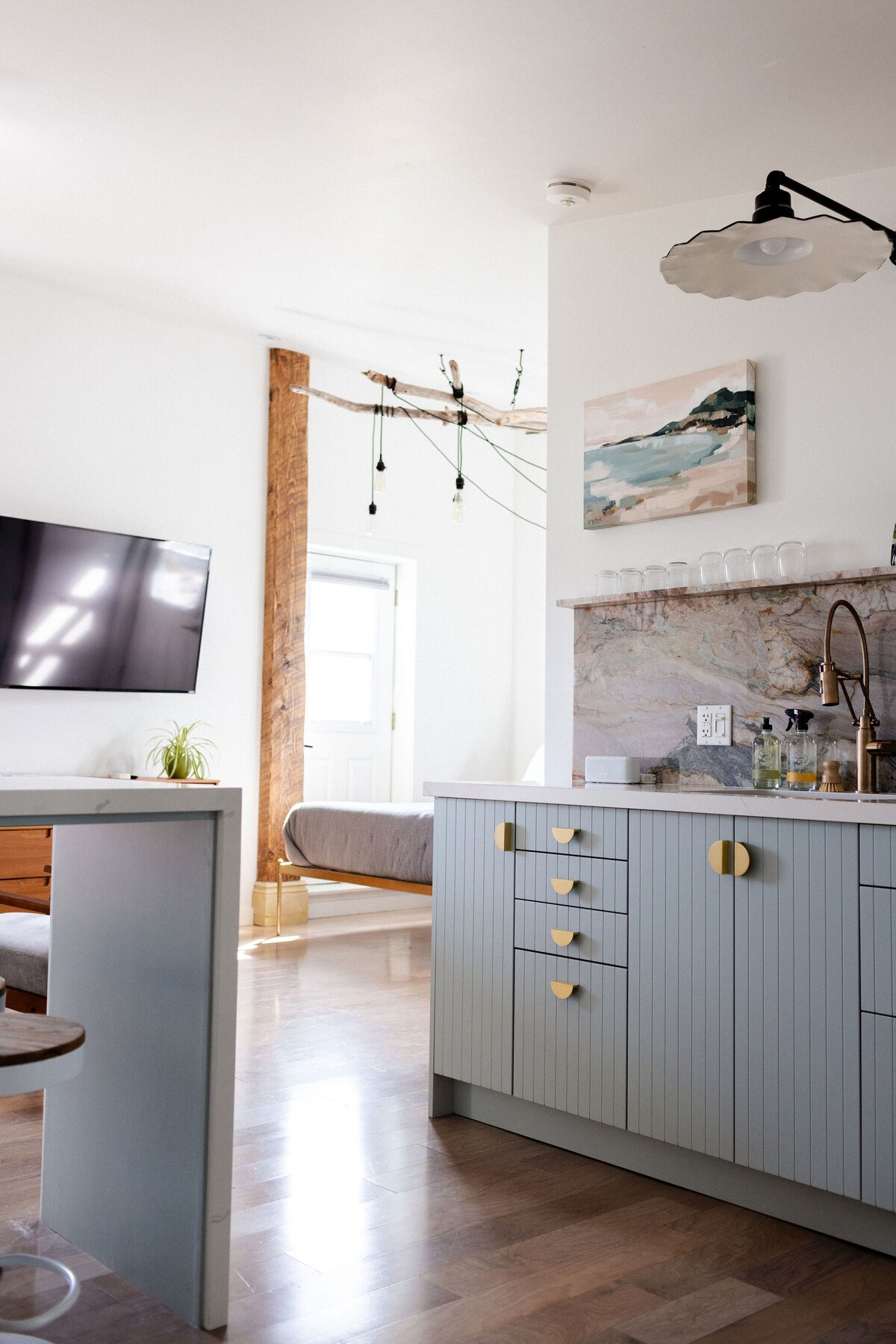 Located right at the village line on route 20, this former roadside motel has been updated with modern, one-bedroom suites. The bedroom has a queen bed, an updated and well-appointed bathroom, and a whisper-quiet mini-split to control the temperature. The living room has a full kitchen with induction cooktop, microwave and retro fridge. The couch pulls out to a queen sized bed. Relax with the whole family at this peaceful place to stay, just a short 15-minute stroll into the village center!