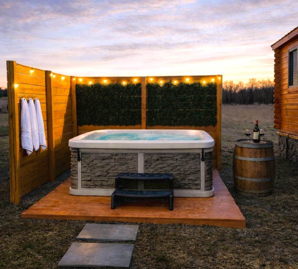 带矿泉热水浴缸的迷你豪华露营小木屋