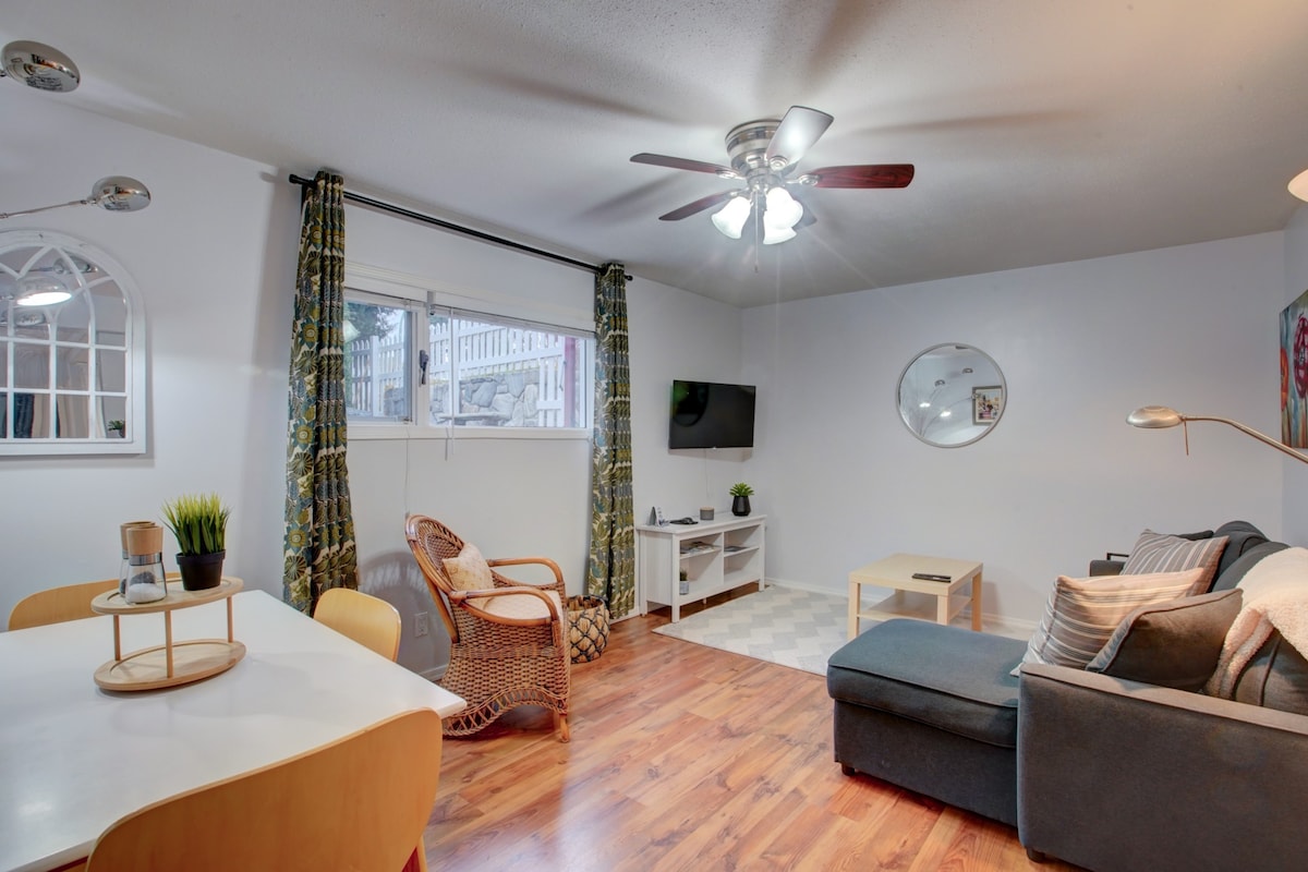 Rainforest Retreat - A serene, jungle inspired hideaway in Kelowna. A freshly renovated private carriage house in a convenient central location, walkable or short drive/bike to beaches/downtown Kelowna, 20 minute drive from the airport. • Full kitchen, new KING bed, full bathroom • Private access with patio space, furniture and BBQ • Fresh carpets and paint throughout, thoughtful tropical inspired accents • Wifi and smart TV • Sofa bed • Free private off street parking for 1 vehicle