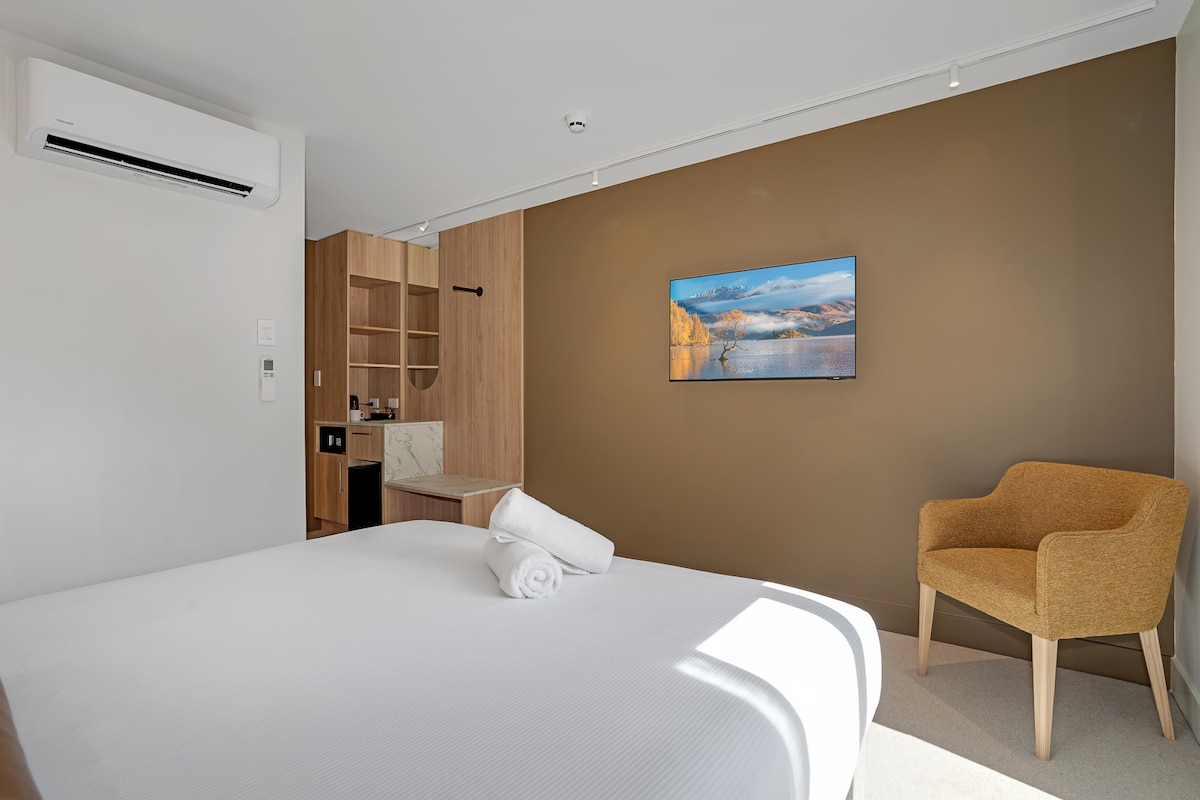 Our Deluxe Queen Room features a comfortable new queen bed in a stylishly renovated room. Rest easy with guest-controlled air conditioning and an in-room-safe for your valuables. The room boasts a cast TV, USB and USB-C bedside charging, under floor heating in the bathroom and free tea and coffee. The bathroom includes accessible features such as level entry, grab bars, and shower chair. However, the bedroom is not wheelchair accessible. This room is for 2 guests only and no cots are allowed.