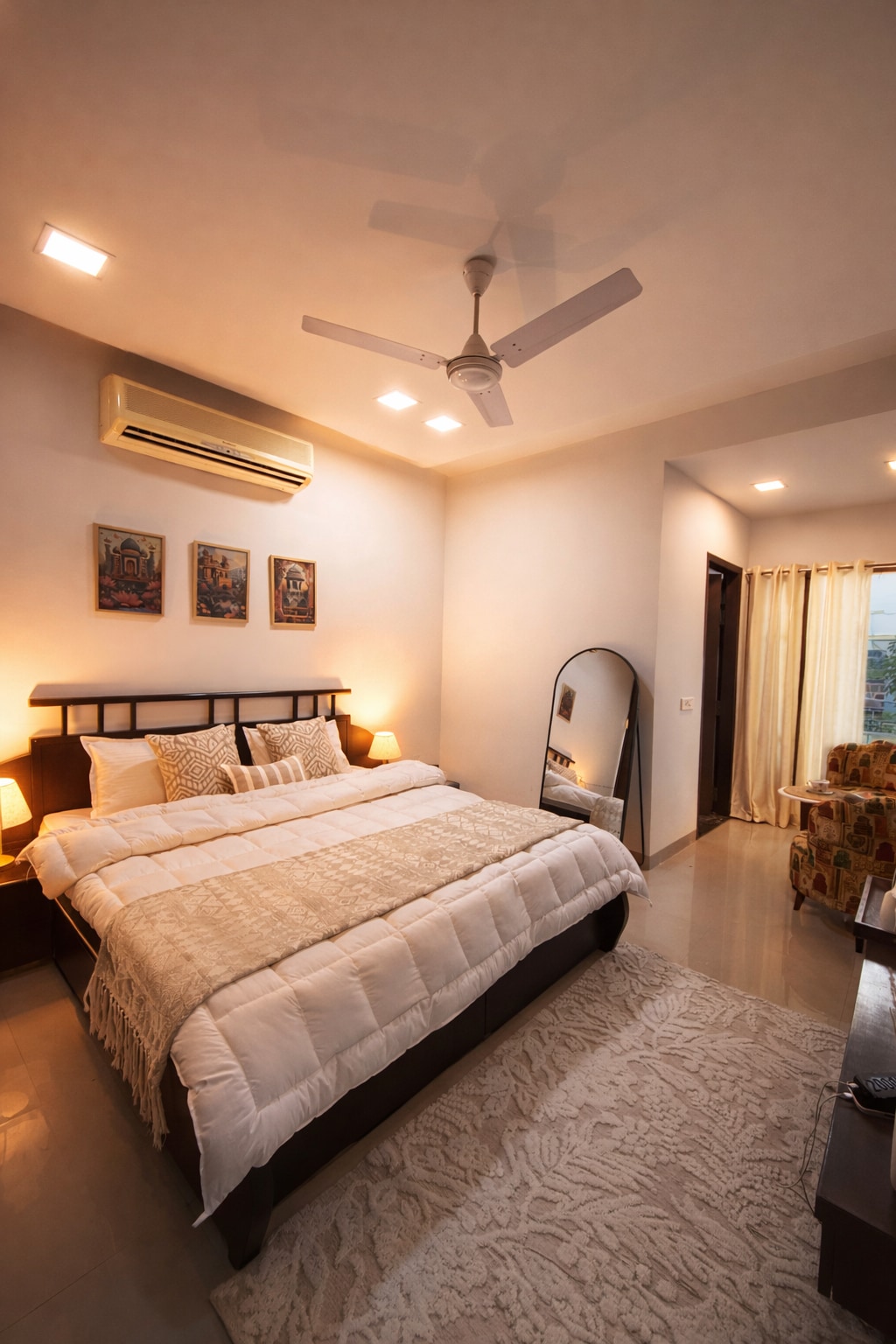 Kindly be informed that this is a studio apartment. Welcome to our studio apartment nestled in the lively Bani Park neighborhood of Jaipur. This stylish one-bedroom studio promises a lavish experience in the heart of the Pink City. With a king-size bed and a sofa-cum-bed the apartment comfortably accommodates three guests. Conceptualized and designed with wellness in mind, the apartment is dipped in neutral tones and soothing hues. Notably, it boasts a luxurious bathtub for your relaxation