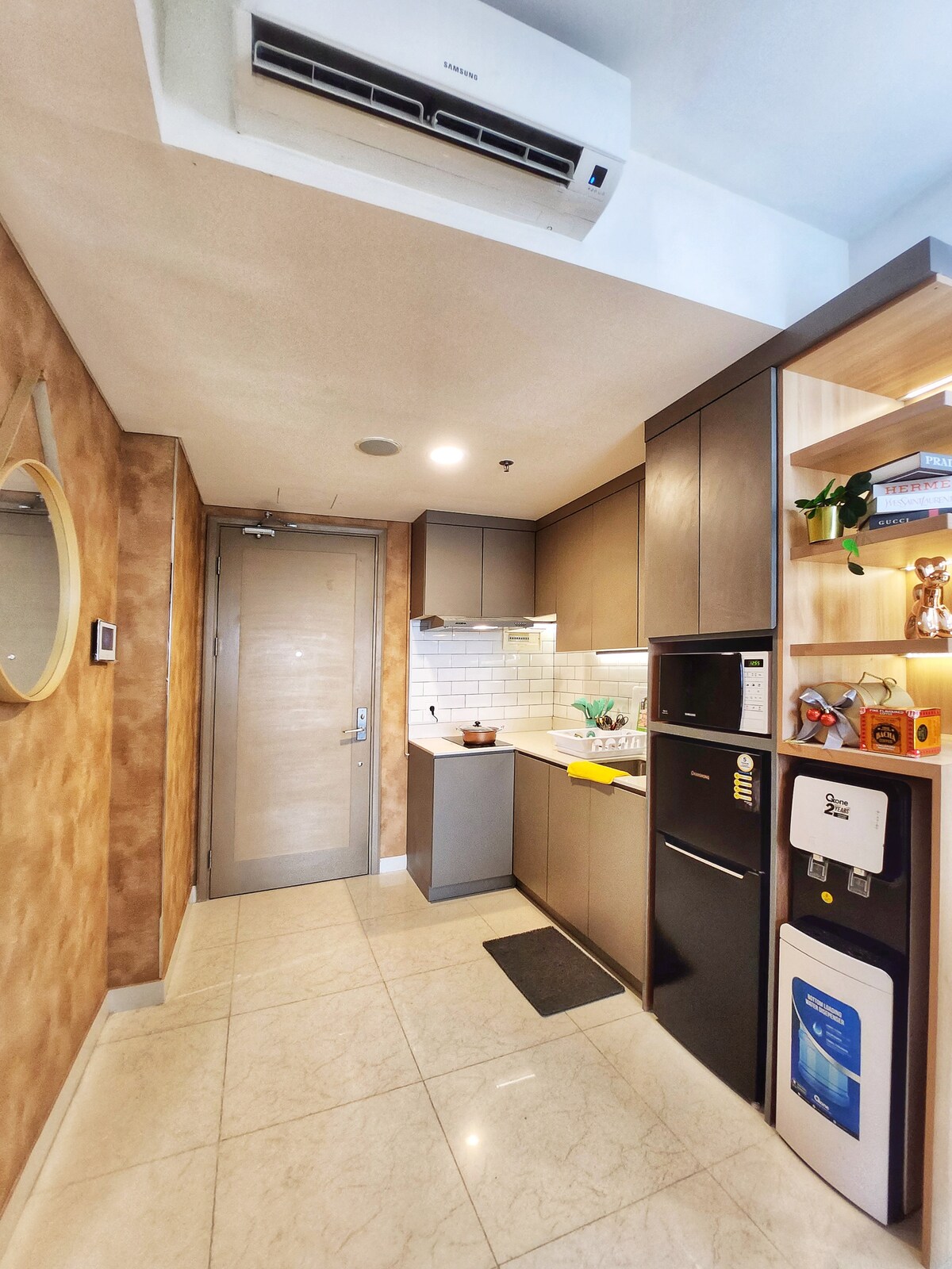 An elegant 24sqm studio in Jakarta's center, blending style and convenience. Includes kitchen, fast Wi-Fi, air-purification, 43" smart TV, sound system and Netflix. It is ideal for various stay types, with contactless access and amenities like pools, jacuzzi, gym, and basketball, Now features a Reverse Osmosis dispenser & food waste disposal, The picture shows a gas stove that has been replaced by an induction cooker (to follow the apartment guidelines for fire hazards)
