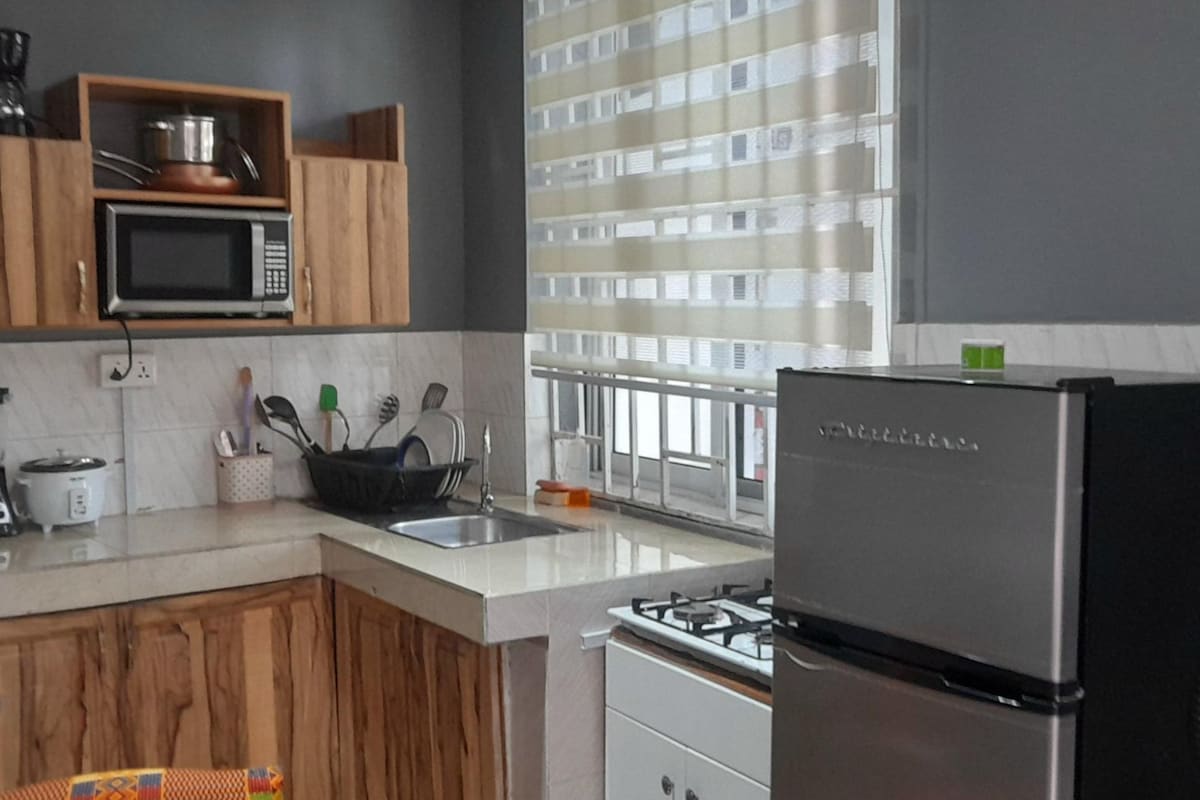 Forget your worries in this spacious & serene 1/1 guesthouse in Cape Coast, Ghana! You will have 2 cold a/c units that you can find in the bedroom & living room. Ceiling fans in kitchen, living room & bedroom. Enjoy a nice hot shower, an amazing soft comfortable Queen size bed to relax in. While relaxing unwind with Netflix or our excellent WiFi service. Nice size kitchen with all your basic cooking needs to create an awesome meal. A small workstation to handle last minute business arrangements.