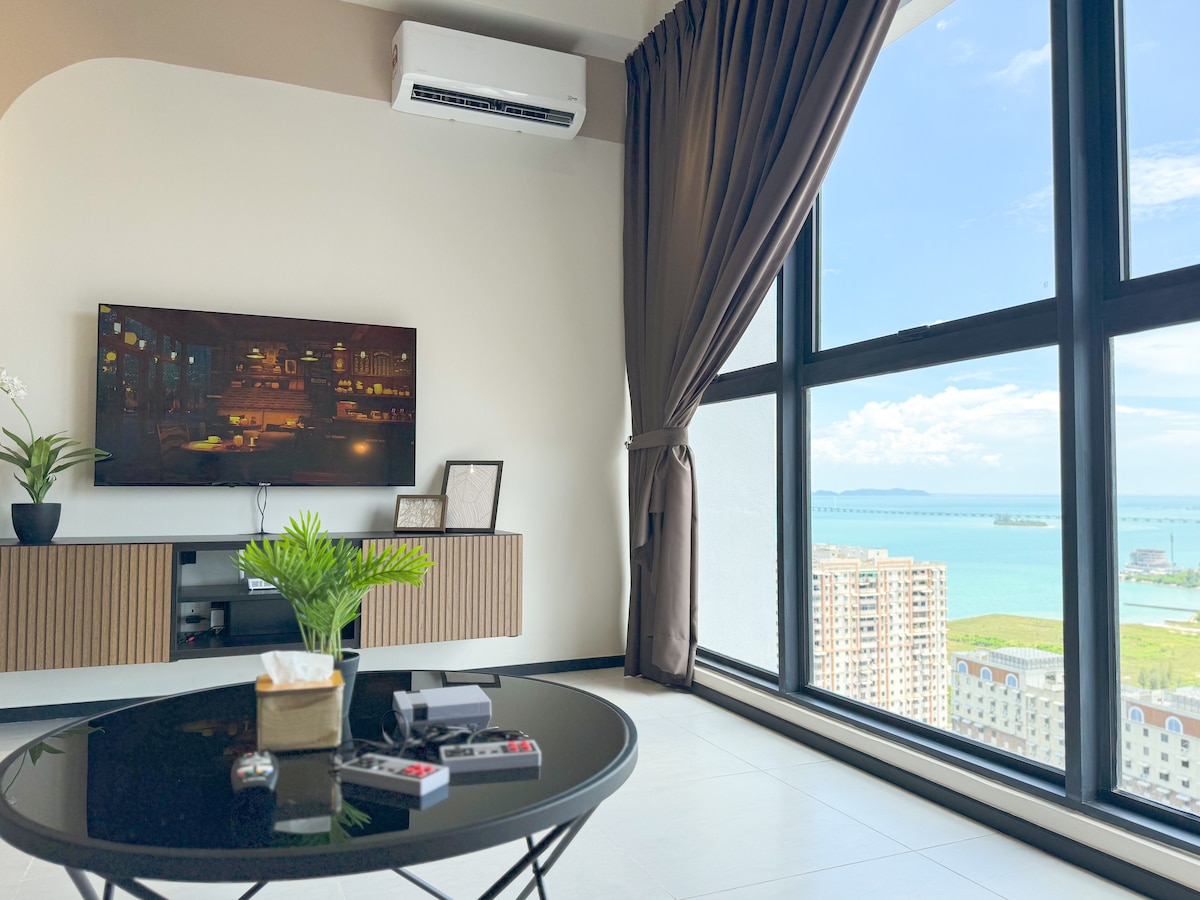 Brand new studio in a high-end service condominium. 3-4 min drive to Penang Sentral, ferry and highway. Georgetown is 15 min away by ferry/ 30 min through Penang Bridge. Hypermarket ECONSAVE is just next door! Enjoy spectacular view of the sea and skyline of vibrant Georgetown from the infinity pool and Sky Lounge. Comfortably host 2 adults (4 can also fit on a short term stay). Great for family with children. Enjoy our food paradise (Penang is crowned the best street food city in Asia by CNN)!
