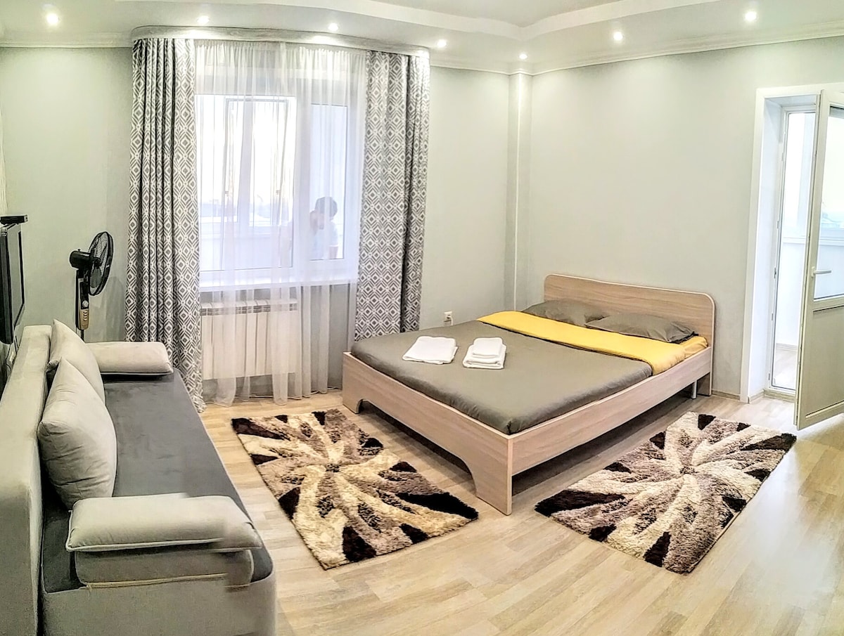 A stylish modern flat is a great option for leisure and business trips. Located in the center of Almaty, 100 m from Abaya Street. Nearby are the circus, the Sports Palace, the Republic Palace, the central stadium, the cable car, Lermontov Theater, Mukhtar Auezov Theater. The studio is fully equipped for 2 people: a sofa, a double bed, a kitchen area with necessary appliances, a bathroom, a large TV and high-speed WiFi. Windows with mountain views and a quiet courtyard.