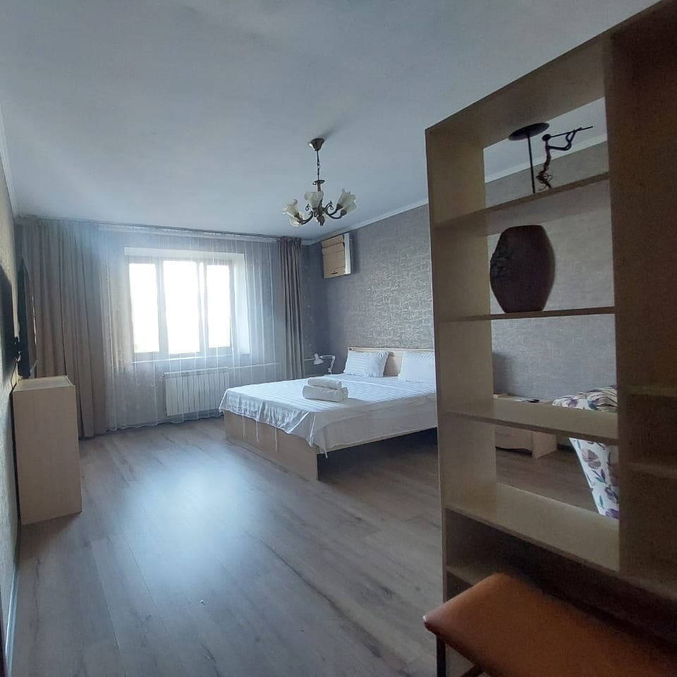 A stylish modern flat is a great option for leisure and business trips. Located in the center of Almaty, 100 m from Abaya Street. Nearby are the circus, the Sports Palace, the Republic Palace, the central stadium, the cable car, Lermontov Theater, Mukhtar Auezov Theater. The studio is fully equipped for 2 people: a sofa, a double bed, a kitchen area with necessary appliances, a bathroom, a large TV and high-speed WiFi. Windows with mountain views and a quiet courtyard.