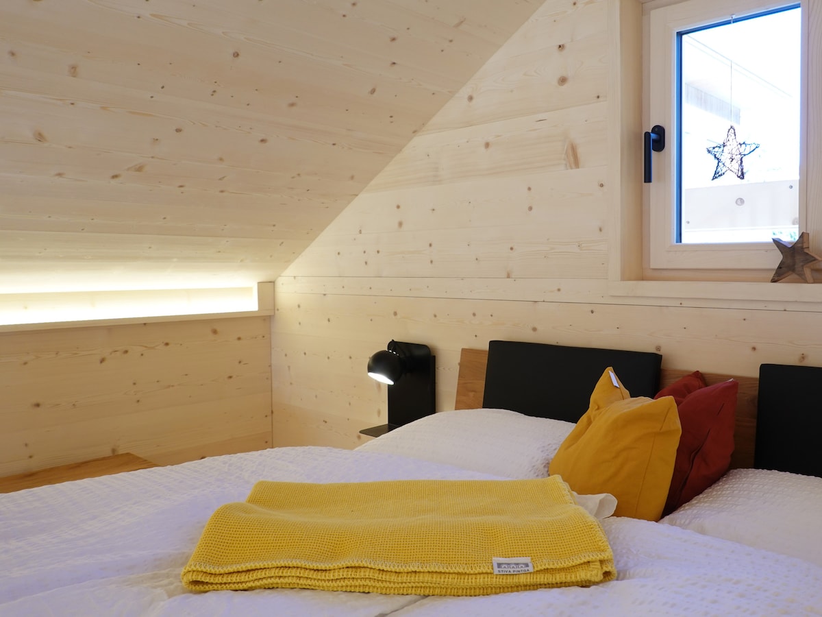 Our Bee House leaves nothing to be desired. It has a new bathroom with shower/toilet and a free-standing bathtub, a living room with a Scandinavian wood stove, a minibar, a Nespresso machine and a sleeping gallery. It is particularly suited for young people who appreciate calm spaces und nature. If the climb up to the gallery is too difficult, there is a comfortable sofa bed available downstairs.