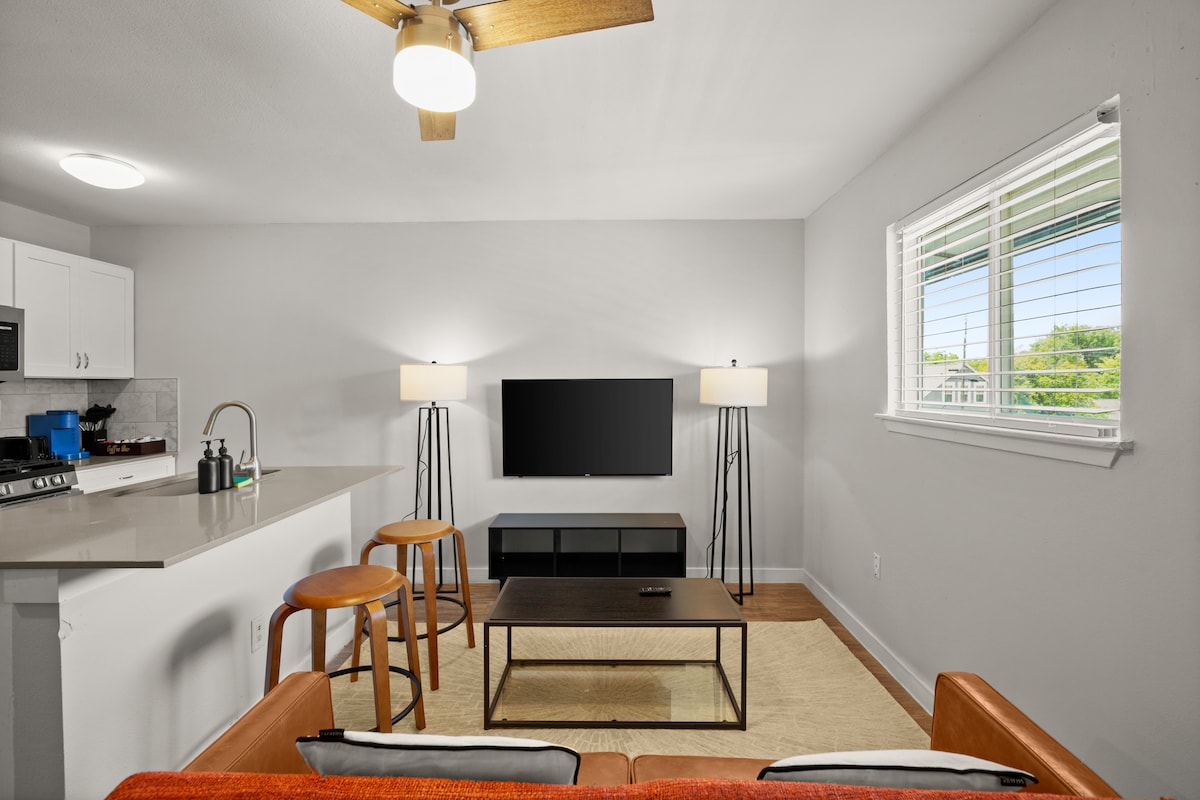 Perfect South Austin retreat just minutes away from the vibrant South Congress, trendy South Lamar, iconic Barton Springs, scenic Lady Bird Lake, and the heart of Downtown along with free parking. Inside, you'll find a spacious bedroom featuring a luxurious California king bed and ample closet storage. Large widows for natural light (curtains are on all windows for privacy) . For additional sleeping space, the cozy living room includes a convenient pullout queen bed from the comfortable couch.