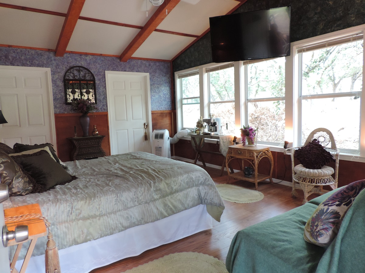 A large suite is room with 7 huge picture windows overlooking a massive 100 year old oak tree, & another growing through the deck; comfy Queen bed + double daybed couch, marbled jacuzzi bath, bistro table & chairs, 60" high-def TV with free Netfliks and rocking chair ! Located in a lovely 30 acre Certified Wildlife Preserve/Horse Ranch/Mini Resort, with picnic tables, BBQ grills, tree swings & encounters with deer, horses, it is a beautiful and peaceful place, perfect to get away from the city.