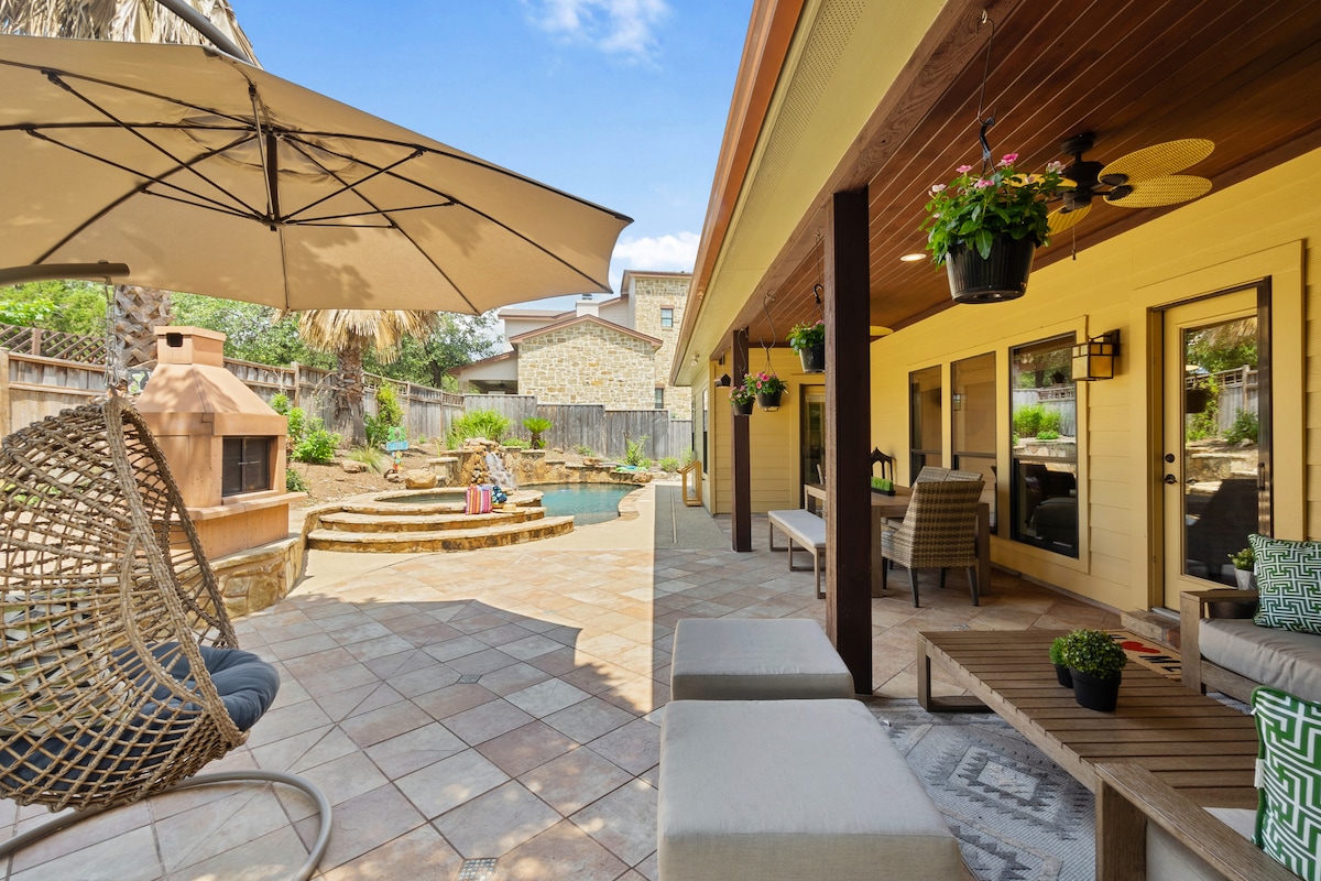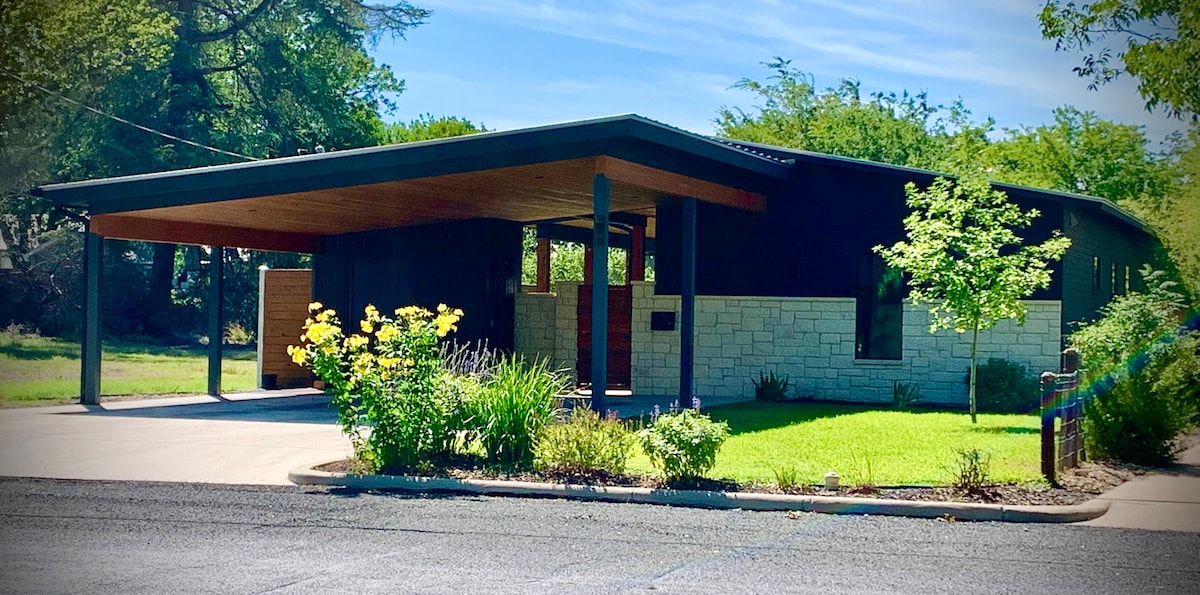 Beautiful “Hill Country Modern” home on five acres with a view of our seasonal pond and the valley. Our home incorporates the use of outdoor living space unlike any other. The patio and breezeway are integral parts of the usable space. One side of Sunrise House has a large living room with a fireplace and huge windows. The house has top-of-the-line fixtures and finishes, a mix of new and curated furniture and decor, and beautiful custom art.