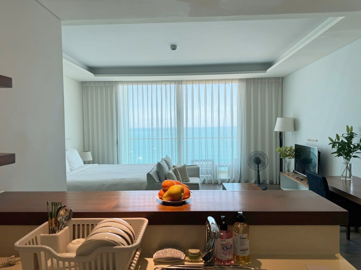 Welcome to a relaxing seaside retreat in the heart of Quy Nhon! This modern and cozy studio with a sea view balcony is located inside TMS Quy Nhon - Hupasearest - just a 2-minute walk from the beach. Ideal for couples, solo travelers or business travelers looking for a clean and fully-furnished space like your own home. 🛏️ The studio is equipped with: 1 comfortable King-size bed. Air conditioning, Wi-Fi, Smart TV. Kitchenette with refrigerator, cooking utensils. Private bathroom with hot water