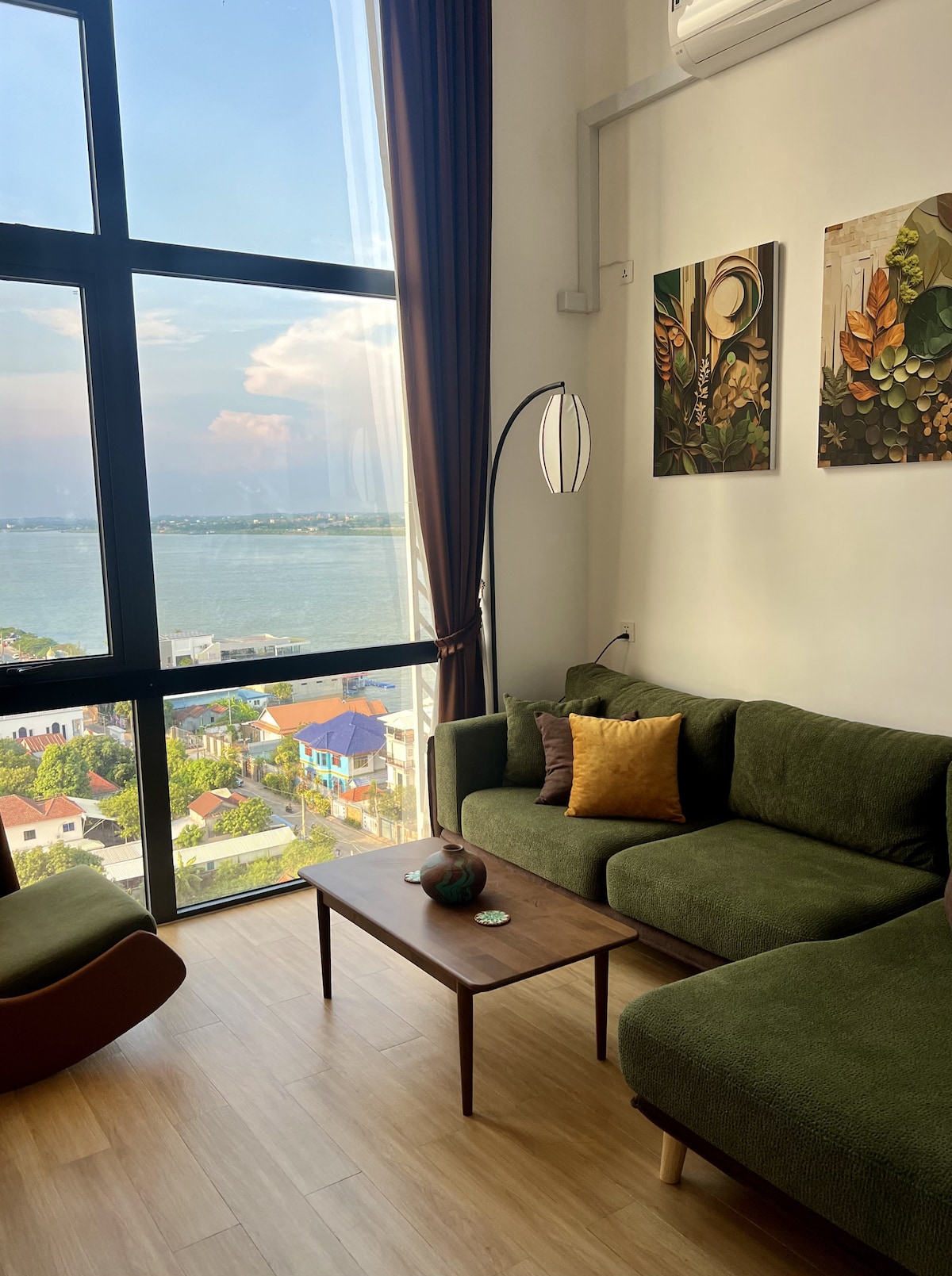 Brand new loft apartment, fully furnished and equipped with energy-saving appliances, interior styled with a minimalist Japanese zen feel. Beautiful high window looks directly out onto the Mekong river, giving you the feeling that you are somewhere far from the city while only a 15 minute drive from the city centre. The compound has several acres of landscaped gardens and a riverside boardwalk. Facilities include 2 swimming pools, gym, sauna, café, minimart and a restaurant