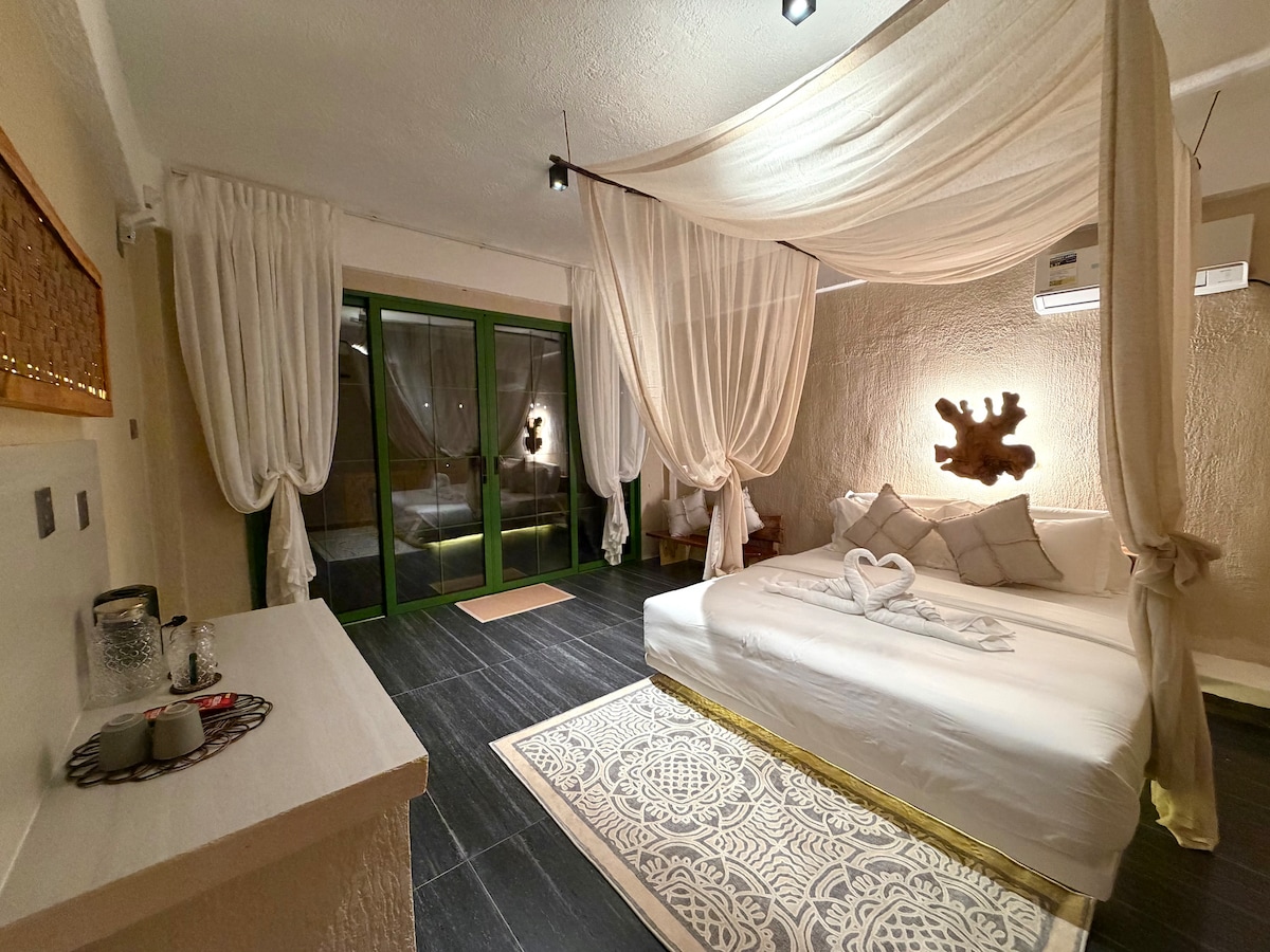 A peaceful ground-floor room surrounded by a lush private garden filled with tropical plants. The sheltered outdoor kitchen is perfect for simple meals or enjoying your morning coffee in a quiet natural setting. Enjoy fast Starlink Wi-Fi, stable electricity ⚡ supported by our hybrid solar, battery, and generator power system, and excellent water pressure 🚿 from our private deep well, along with our beautifully naturally filtered 90 m² swimming pool just a short walk from your room.