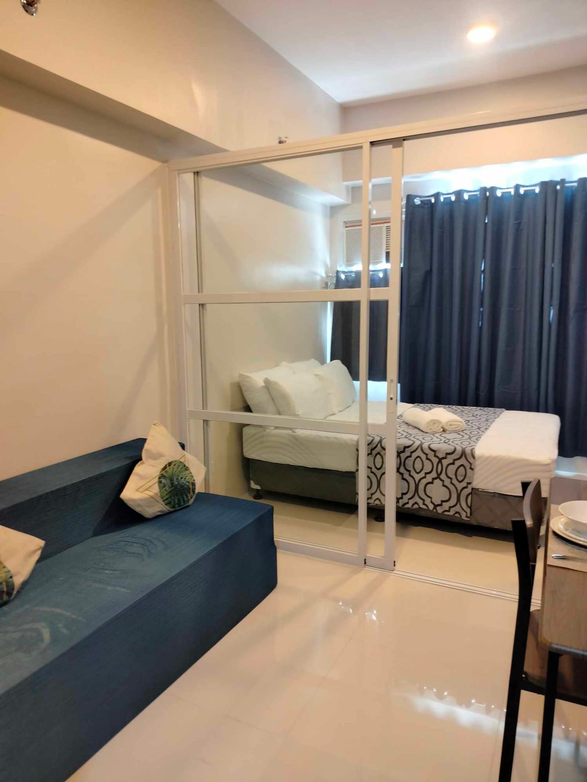 Comfy, accessible, and aesthetic condo studio unit near Mactan Cebu International Airport 24 sqm condo unit with balcony Oceanview with Queen-sized bed • can fit 4-6 pax • extra foam mattress and extra blanket provided • free pool access for 2, paid parking inside Bathroom with: • shower, heater, bidet • shampoo | conditioner | body gel provided • towels Entertainment • 200 mbps internet connection • 1080p 4K Smart Projector with surround sound • Mini karaoke • Card and board games