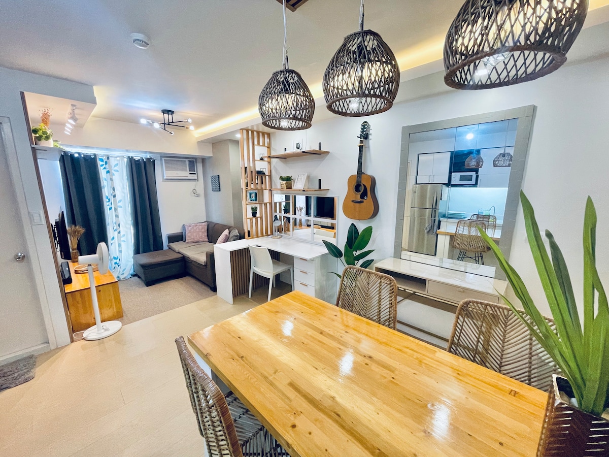 Enjoy a stylish experience at this centrally located place. Relax in this entirely cozy, modern and vibrant condo unit that is conveniently located near Mactan International Airport. Where it is close to everything like restaurants, coffee shops, laundry shops, malls and supermarket. - 3-5 minutes away from Mactan Airport - High-Speed Internet up to 200 Mbps - 65 inches TV with free Netflix - 1 Bedroom w/ 1 queen-size bed & 1 Foldable double size bed - Washing Machine -Fully equipped kitchen