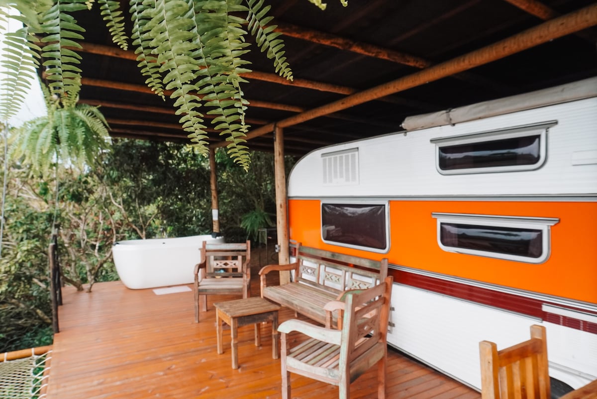 Maior trailer de Alto, Sofá Trailer vintage em meio à natureza, cercado por uma vista exuberante e apenas 5 minutos da cidade de Alto Paraíso. - Hidro coberta e aquecida, - Quarto com cama de casal e TV multicanal; - Banheiro com chuveiro quente - Cozinha completa e equipada, - Ar condicionado e aquecedor, - Espaço para Home office com Wi-Fi exclusivo; - Lareira externa com lenha à vontade; - Rede na varanda; - Prainha de areia; - Churrasqueira; - Janelas com blackout - Estaci. privativo