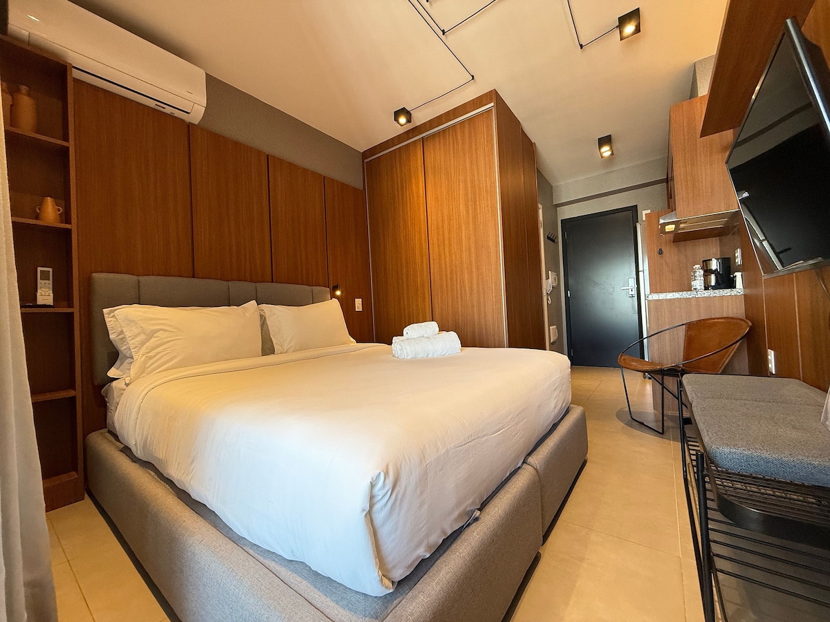 Studio 40011: 4 min do Allianz Parque. Estúdio compacto, moderno e completo e confortável em uma das regiões mais culturais de SP. 📍 Cercado por cafés, restaurantes e shows. Aqui a cidade pulsa ✨ Cama aconchegante, bancada, armário, ar-condicionado, TV, e cozinha equipada com sanduicheira, air fryer, cafeteira, fogão, geladeira. 🚿 Banheiro privativo e iluminação acolhedora. com aquele clima de "quero ficar mais um pouco" Perfeito para curtir, descansar ou trabalhar. Reserve agora!