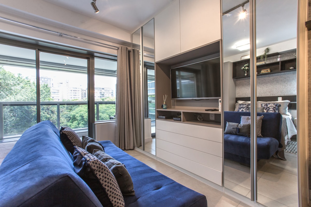 Enjoy the bohemian and artistic Vila Madalena, full of bars, restaurants and cafes. You can get to know the region or even take a tour to city parks with a bike, avaiable free of charge. Will you come to work? Focus on it at the confortable table facing the green balcony with a beautiful view of the tree tops. After all, enjoy the gym, poll, sauna and snooker room for your complete leisure.