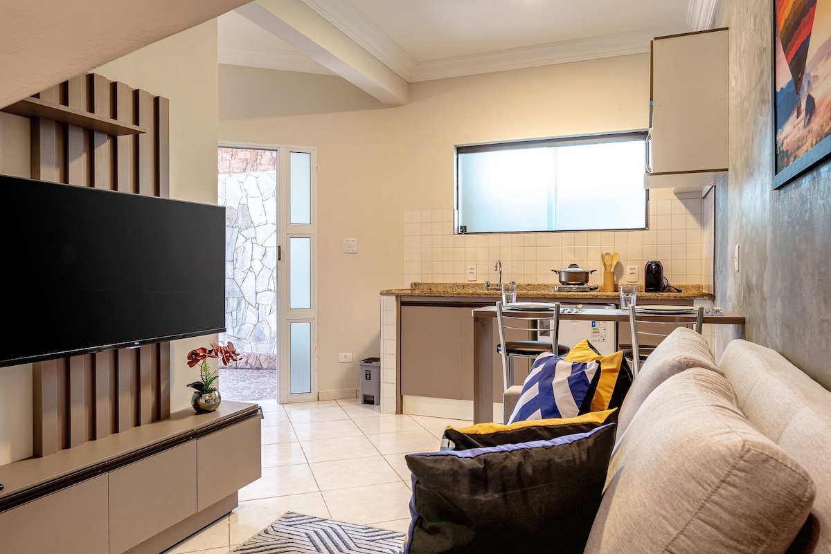 Next to Lago do Holandes. Balcony, bedroom, open-plan living with kitchenette, and brand-new bathroom. Spacious for couples, sleeps up to four. The living room converts into a second bedroom. 43-inch Smart TV, minibar, microwave, A/C, and coffee maker. Private loft and balcony. Shared garden with fire pit. 2 minutes from downtown. A roomy, comfortable, minimalist retreat to slow down and breathe Holambra. Stroll by the lake, enjoy flower-filled squares, and stay close to cafés and restaurants.