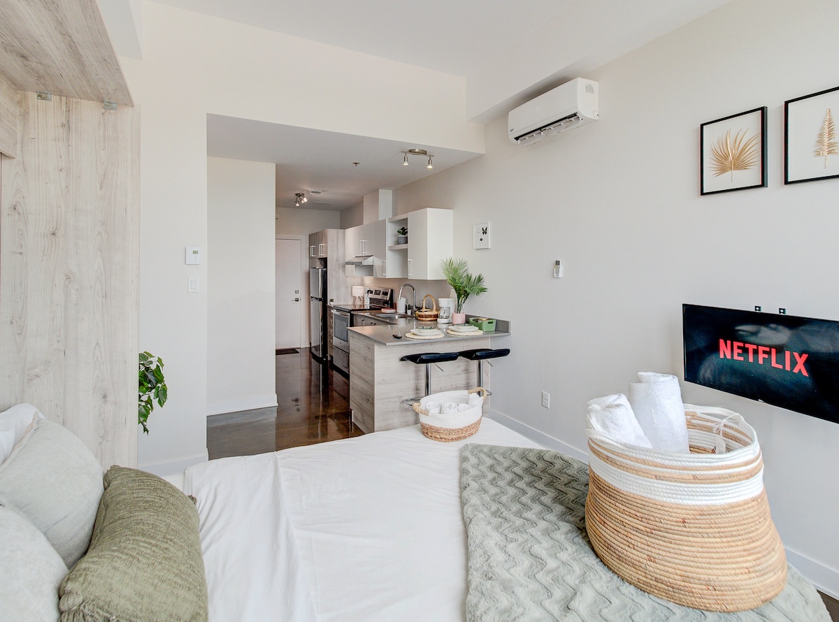 Experience elevated living at Monroe, a luxury residence in the heart of downtown Montreal. This spacious 1-bedroom apartment features a private bedroom with a queen bed, a bright living area, and a private balcony with stunning city views. Enjoy access to premium amenities including a rooftop pool, jacuzzi, terrace, gym, sauna, and hammam, all just steps from the Bell Centre and Montreal’s top attractions. 🛎 24/7 front desk 🧳 Luggage storage available Perfect for couples, business travele