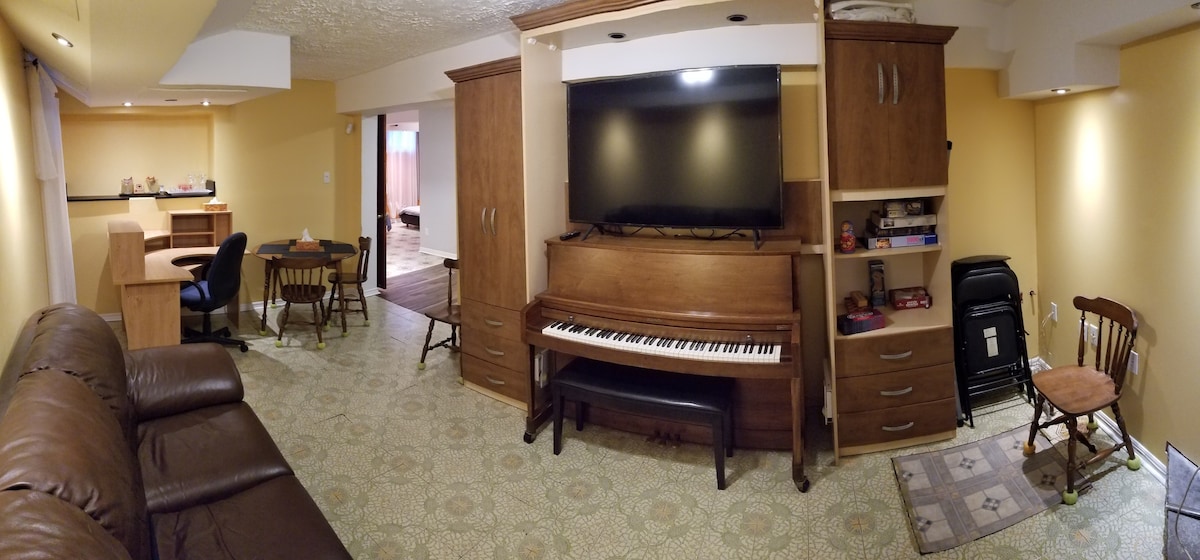 Small studio (6 by 22 feet) (it is not basement) (ONLY FOR NO SMOKER) with private bathroom, private kitchen, private entrance and private parking in a single-family house. It is equipped with a wall-mounted heat pump, induction cooktop, small oven, microwave, refrigerator, underfloor heating, humidity detector, oil heater, Smart TV (Bell TV). The bed is not double, it is queen. Washer and dryer are shared. Several shops within walking distance.