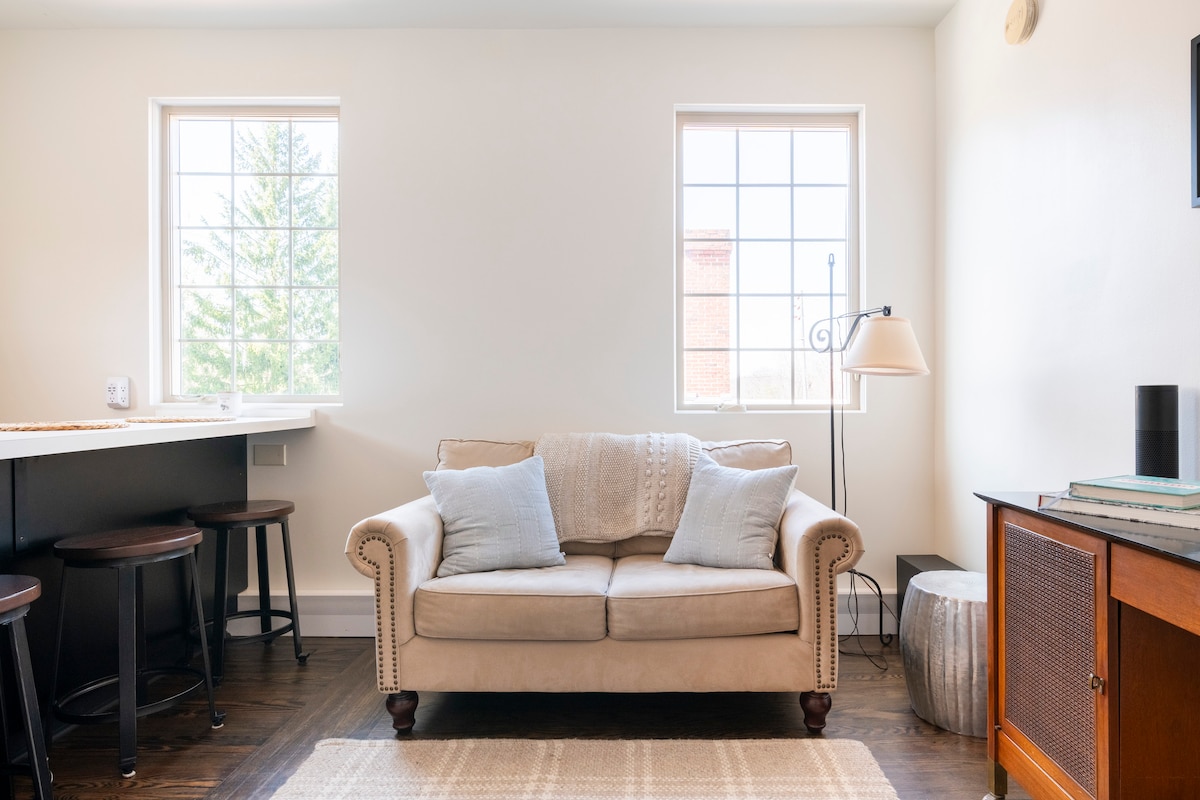 A modern & private suite with breathtaking views overlooking the valley. Simplistic decor with clean lines are sure to help you relax. Get a good night's rest on plush bedding, then wake & enjoy a hot cup of coffee on the patio or porch swing. Unwind in the hot tub after a long hike, go fly-fishing on world-class Spring Creek only miles away, or drive 8mi to Penn State for game day. Space is newly renovated & always improving! Stays 7+ days include complimentary professional laundry service.
