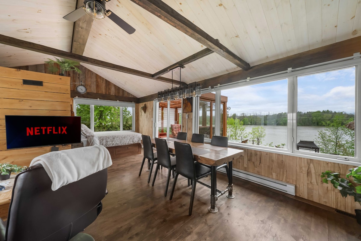Superbe chalet caractérisé par son ambiance chaleureuse et des équipements luxueux. La chambre, située sur une mezzanine, offre une vue imprenable sur la rivière St-Maurice. Elle est équipée d'une baignoire pour un moment de détente ultime. Le chalet propose différents types d'embarcations pour explorer la rivière. Bien que le site soit généralement paisible, il est possible d'entendre le passage de certains véhicules dans certaines circonstances. Véhicule VUS ou 4x4 est recommandé en hiver