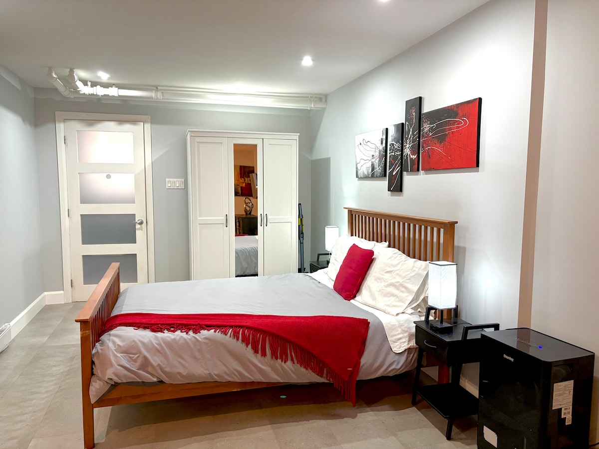 Un loft avec balcon, salle de bain privée, cuisinette privée, entrée et stationnement privés dans une maison unifamiliale proche de Montréal. Il est équipé par thermopompe murale, table de cuisson à induction mobile, petit four en acier inoxydable, plancher chauffant, détecteur d'humidité, smart TV(Bell) etc. Le est queen. Laveuse et sécheuse sont partagées. Rénovation complétée en janvier 2023. Les meubles sont de 2023. Plusieurs commerces accessibles à pied.