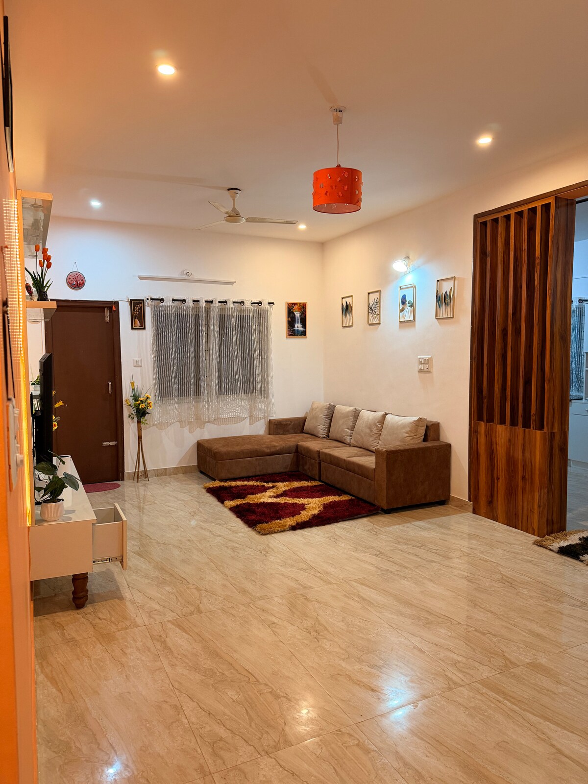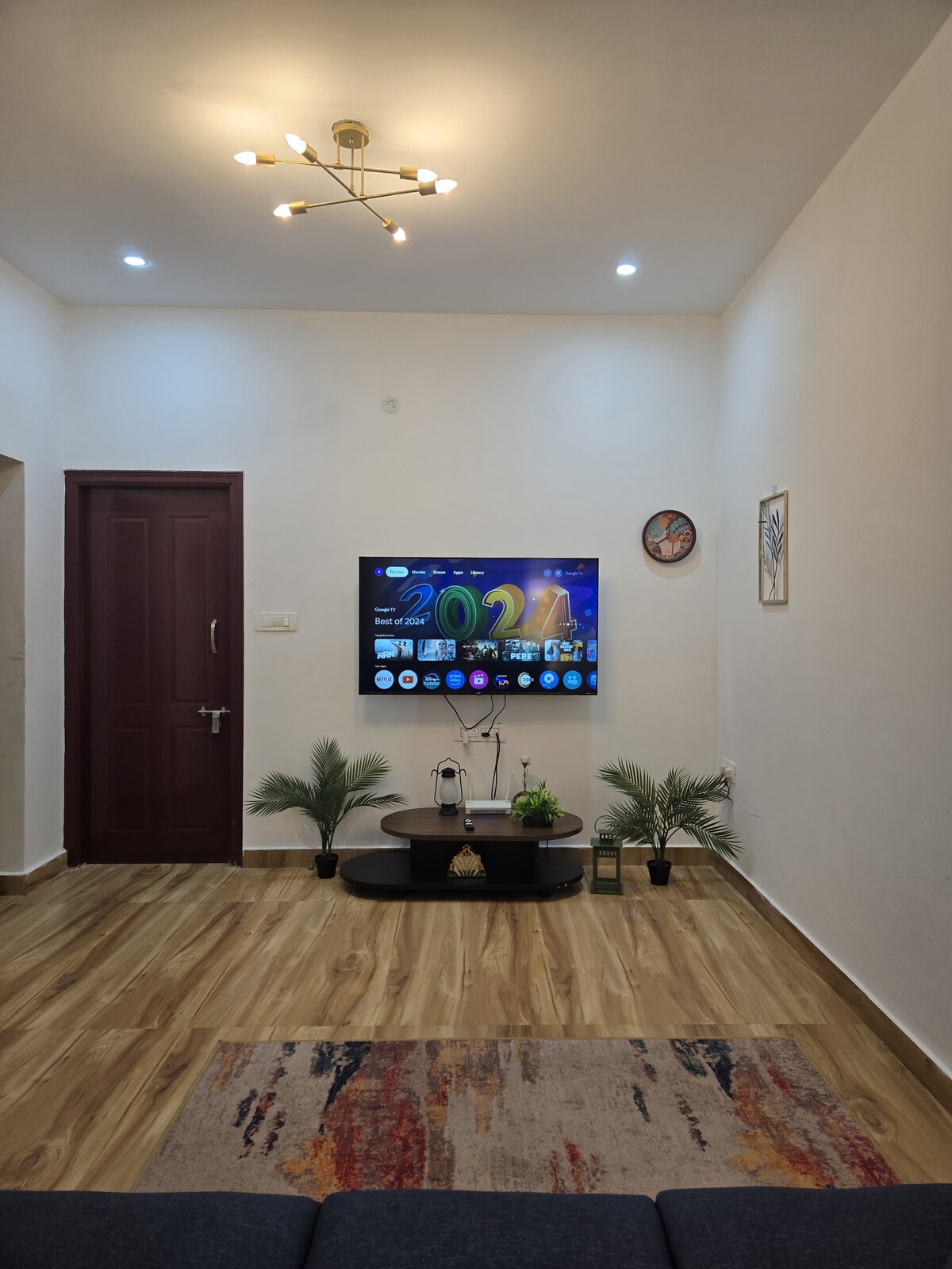 Welcome to our brand new, spacious 2-BHK apartment, ideal for families and couples seeking comfort and convenience. The bedrooms have queen size beds with orthopedic mattresses and AC for a restful night's sleep. Relax in the large living room with a 43-inch Smart TV, lightning-fast WiFi and a dedicated dining area. Comes with two super clean bathrooms stocked with bath essentials. The fully equipped kitchen includes high-quality appliances and crockery for your culinary adventures.