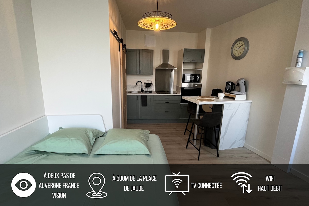 Studio "L'élégance" Place de Jaude Logement Chic et Tendance avec une situation exceptionnelle Quartier prisé à l'entrée du Centre Jaude (plus de 100 boutiques et cinéma) et à 20 mètres de la Place de Jaude, lieu emblématique de Clermont Ferrand Bénéficiez d'un garage privatif en sous sol de la résidence avec ascenseur. Le logement est équipé du wifi, d'un téléviseur connecté 138 cm avec Netflix et le nécessaire de cuisine. Literie Queen size 160 haut de gamme Au plaisir de vous accueillir