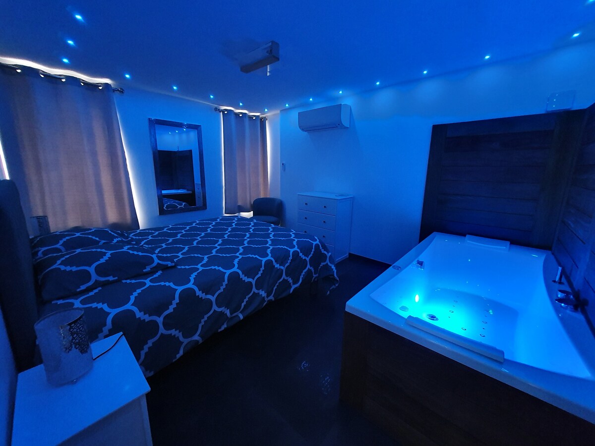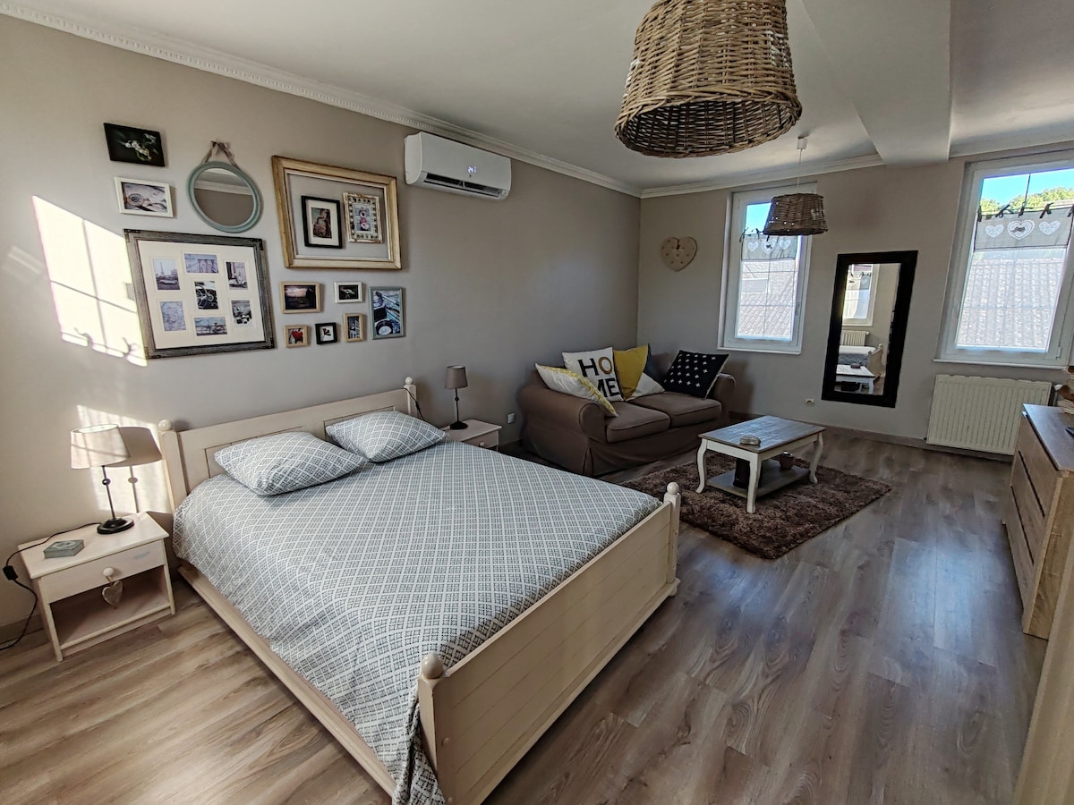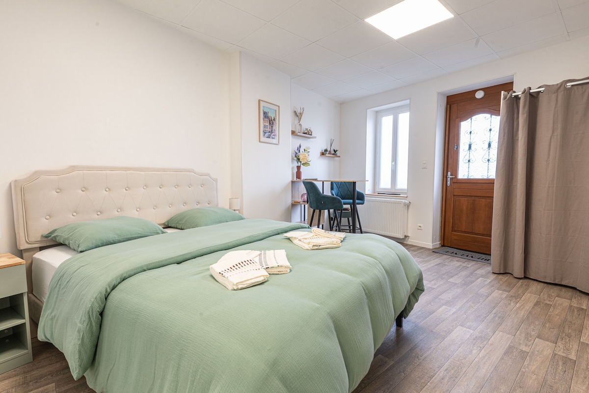 Espace privatisé au rez-de-chaussée de notre maison, situé au coeur de Moulins, composé d'une grande chambre ( 1 lit double ou 2 lits simples), TV, meuble de rangement ... d'une cuisine équipée et d'une salle d'eau et wc. Vous pourrez également accéder à notre patio équipé d'un jacuzzi. Entrée indépendante + parking gratuit à proximité