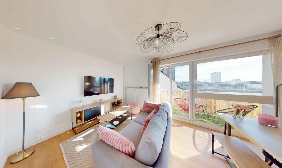 Venez séjourner dans ce bel appartement au calme et dans Metz, situé à pied : 3 min des Arènes, à 5 min du Centre Pompidou, 10 min de la Gare et 15 min du Centre Ville. En bordure du parc de la Seille pour vos promenades matinales, cet appartement de 70m2 se compose d'un grand salon ouvert sur une cuisine moderne, une grande chambre (+ lit parapluie sur demande), une salle de bain avec baignoire, un balcon agréable entouré de verdure, des toilettes séparées, ainsi qu'un parking RDC.