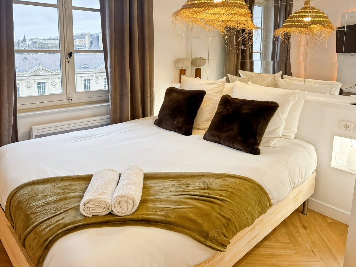 🎯 Rennes city center. 🚶🏻♂️ 3 min walk to bars and restaurants. ❤️ Perfect for a couple's experience. 📐 50m² with Living room + Bedroom + Kitchen. 🚘 Free private parking space. 🖥 High-speed fiber internet. 🖼️ Panoramic view of the city center. 🍜 Fully equipped kitchen, shower room. 🛋️ Living room with sofa, 4K TV, Netflix, YouTube. 👮♂️ 24-hour security in the building.