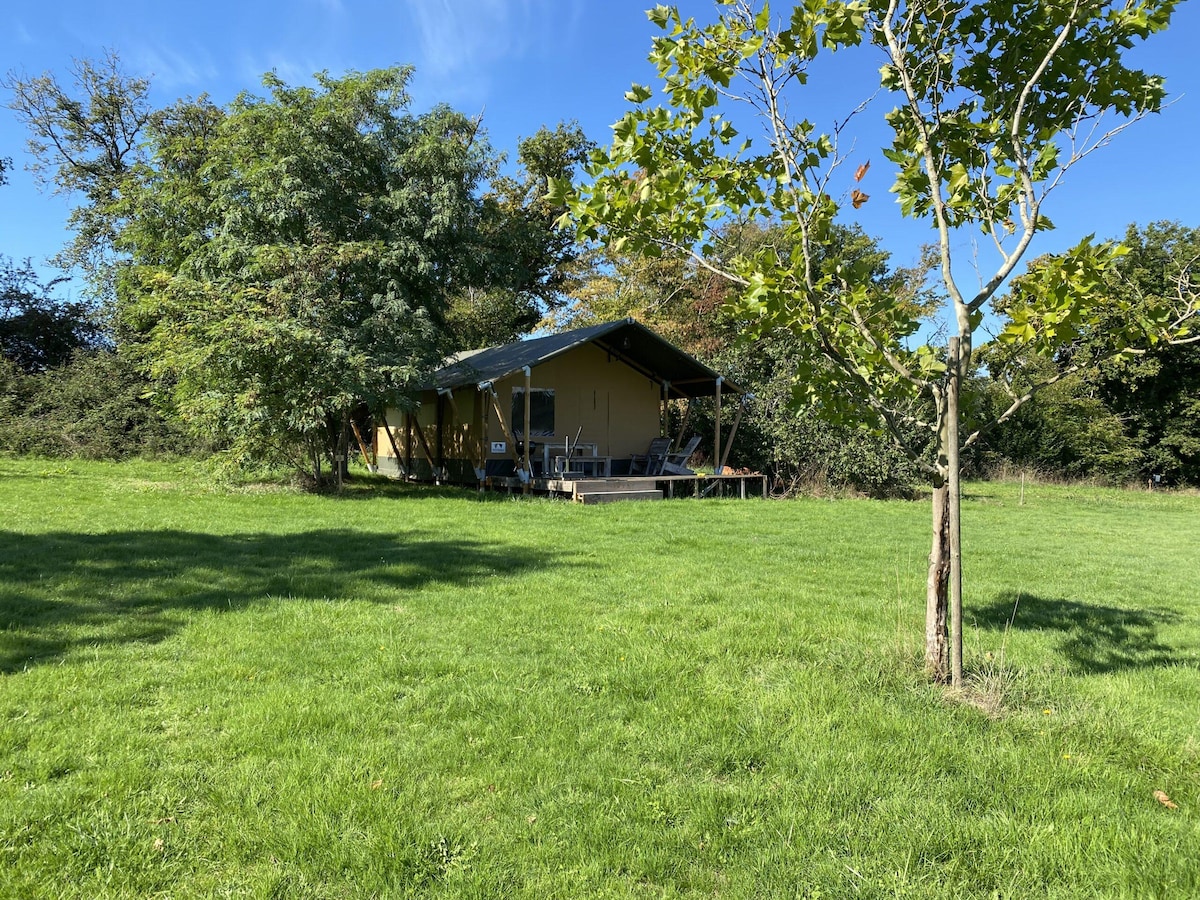 Une vue à couper le souffle en surplomb de la vallée du Loir. Profitez du calme de la campagne, du chant des oiseaux et laissez-vous envelopper par la nature... Une tente, oui ! mais avec un vrai lit en bois massif, un matelas confortable et aussi une salle de bain de campagne (lavabo, douchette solaire et toilettes sèches). Parfait pour un week-end en amoureux, un besoin de déconnexion, une envie de calme, un retour vers la nature, un avant goût de vie sauvage...