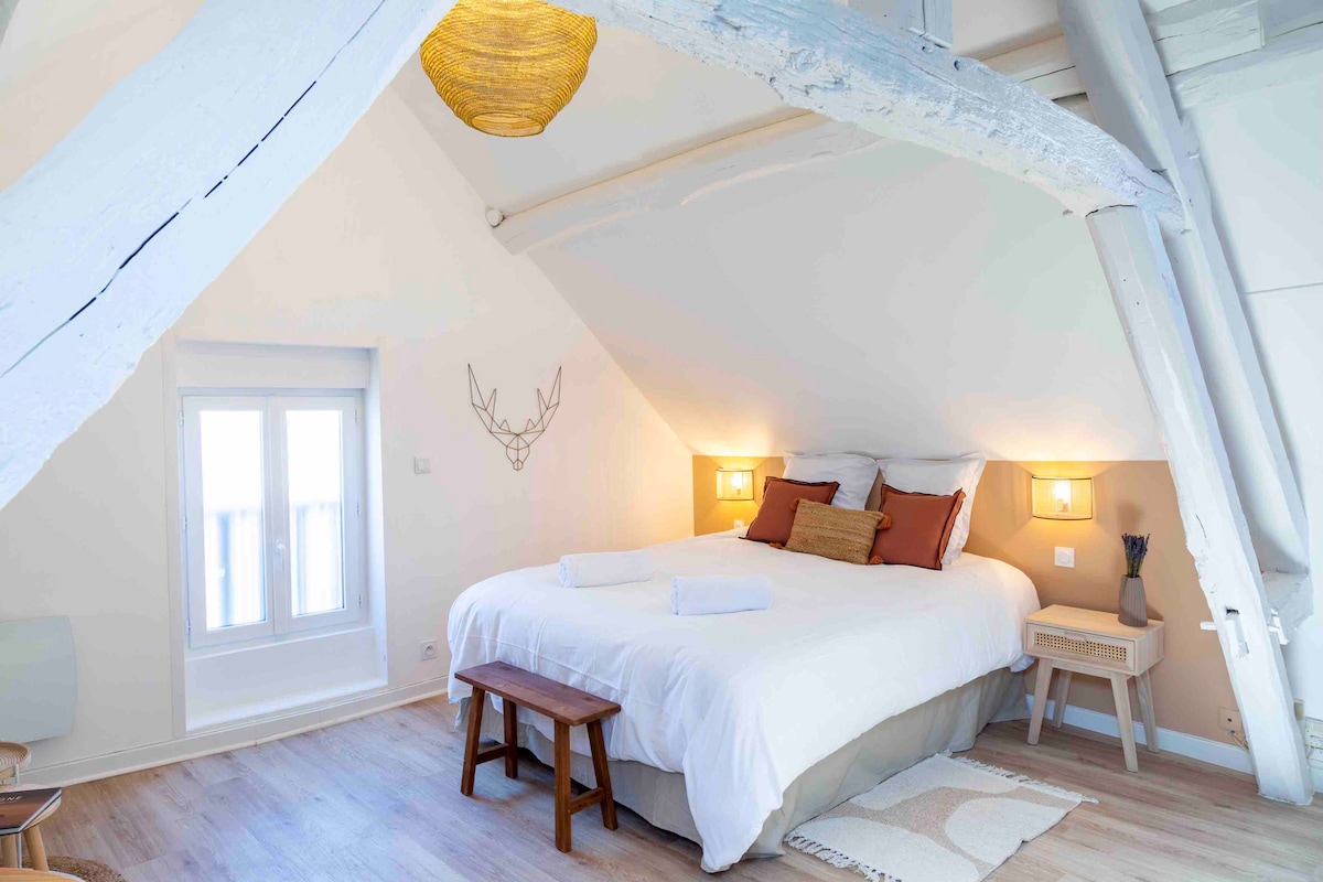 Dans 1 maison du XIXEME pleine de charme, 1 gîte pour 1 famille de 4, refait à neuf, totalement indépendant, très bien équipé, avec son jardin, sa terrasse (BBQ) et sa place de parking privative. Composé d’1 pièce de vie de caractère de 30m2 avec 1 Cuisine équipée, 1 Coin repas et 1 Coin TV (box), 1 chambre double (lit en 160), 1 petite chambre pour 2 jeunes (2 lits simples empilables), 1 salle d’eau avec WC, 1 local à Velos. Équipement bébé sur demande. Les lits sont faits à votre arrivée
