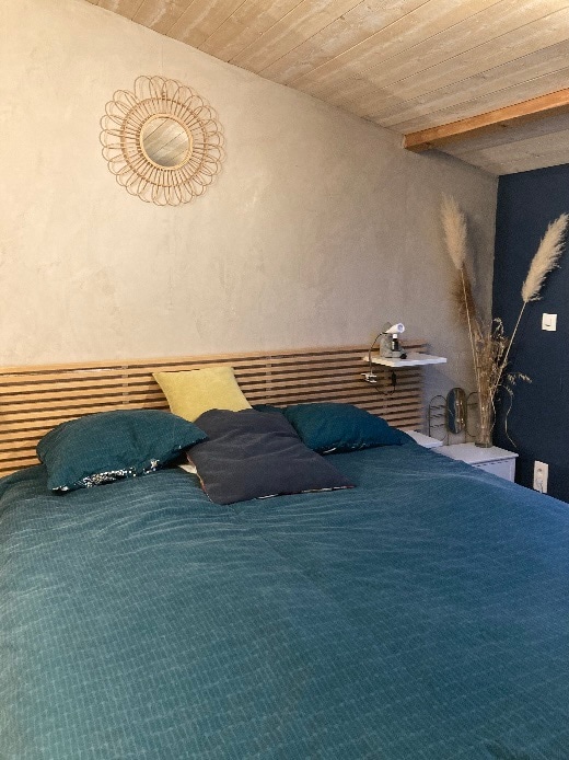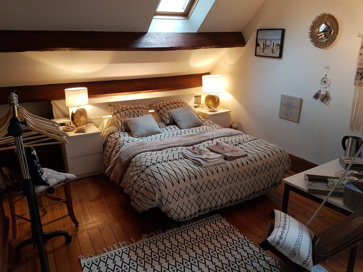 La chambre que nous avons aménagé spécialement pour nos hôtes est charmante, simple mais confortable. Un grand lit, une salle d'eau avec douche à l'italienne et toilettes privés au premier étage de la maison bleue. Le thème bord de mer est en accord avec notre localisation. Un petit-déjeuner simple vous est proposé en supplément et la possibilité d'un brunch pour les dimanches en matinée. Une table d'hôtes est possible également le soir en week-end