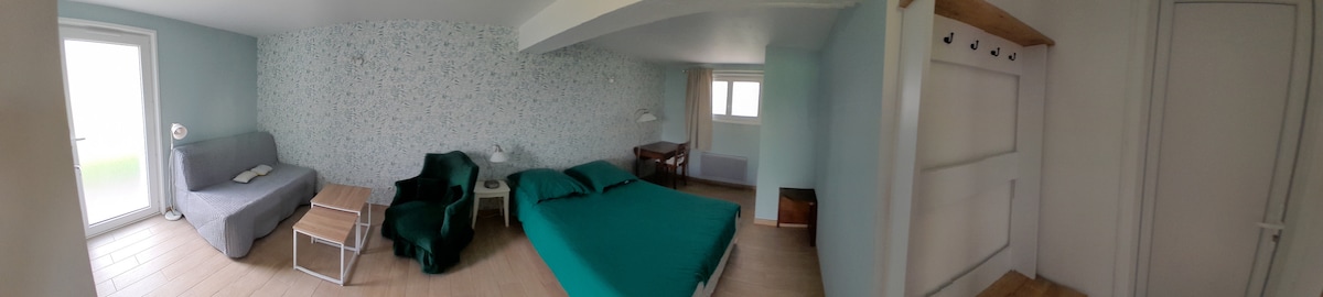 Vous serez logé au calme dans une chambre trés lumineuse . Pour votre petit déjeuner ou pour réchauffer ou préparer vos plats vous pourrez utiliser la cuisine commune. Si la météo le permet une table et deux chaises sont à votre disposition dans le jardin pour prendre vos repas. le garage peut accueillir 1moto ou un vélo.