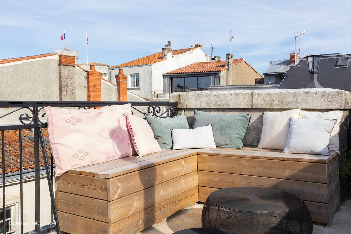 à deux pas du marché couvert de La Rochelle, au coeur de la vieille ville historique avec ses commerces, restaurants et bars ... maison atypique de 150 m2 sur deux étages, beaux volumes, avec terrasse de 25 m2 donnant sur les toits et grand garage.