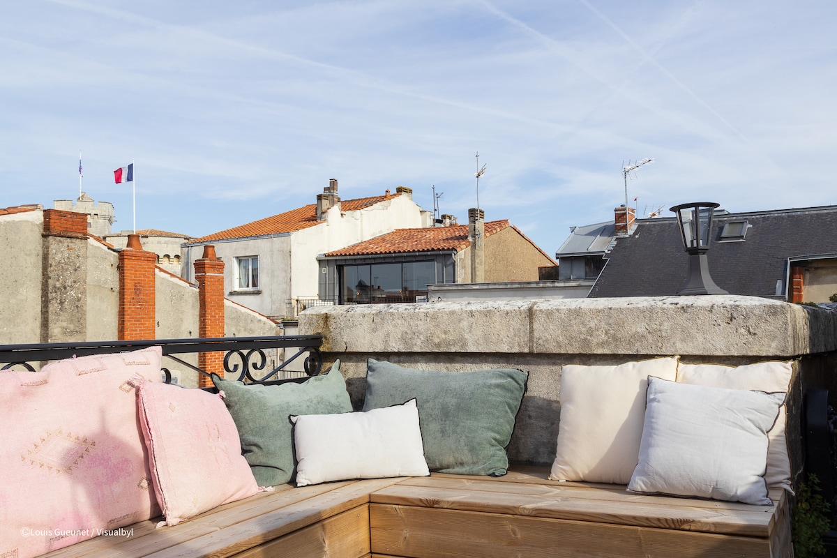 à deux pas du marché couvert de La Rochelle, au coeur de la vieille ville historique avec ses commerces, restaurants et bars ... maison atypique de 150 m2 sur deux étages, beaux volumes, avec terrasse de 25 m2 donnant sur les toits et grand garage.