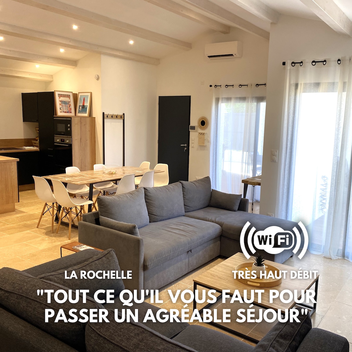 A quelques pas de la mer notre spacieuse maison de 130 m2 classée « meublé de tourisme 3⭐️ », se situe à Lauzières (village ostréicole aux portes de la Rochelle et près du pont de l'Ile de Ré). Elle se compose de 2 chambres climatisées à l’étage et d’une chambre au RDC, d’une salle d’eau , d’une salle de bain ,d'un salon climatisé de 40 m2, ainsi que d' une grande cuisine climatisée de 30m2 donnant sur un espace extérieur intimiste.