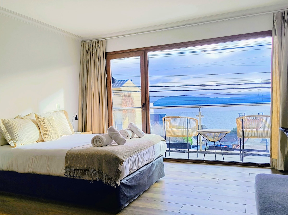 Welcome to your boutique retreat facing the majestic Lake Nahuel Huapi, featuring panoramic views, a heated pool, jacuzzi, and gym. Modern design and comfort, just 15 minutes from downtown Bariloche. Located in a peaceful area, ideal for couples or travelers seeking relaxation. Wake up to unique views of the lake and mountains, surrounded by nature and Patagonian style.