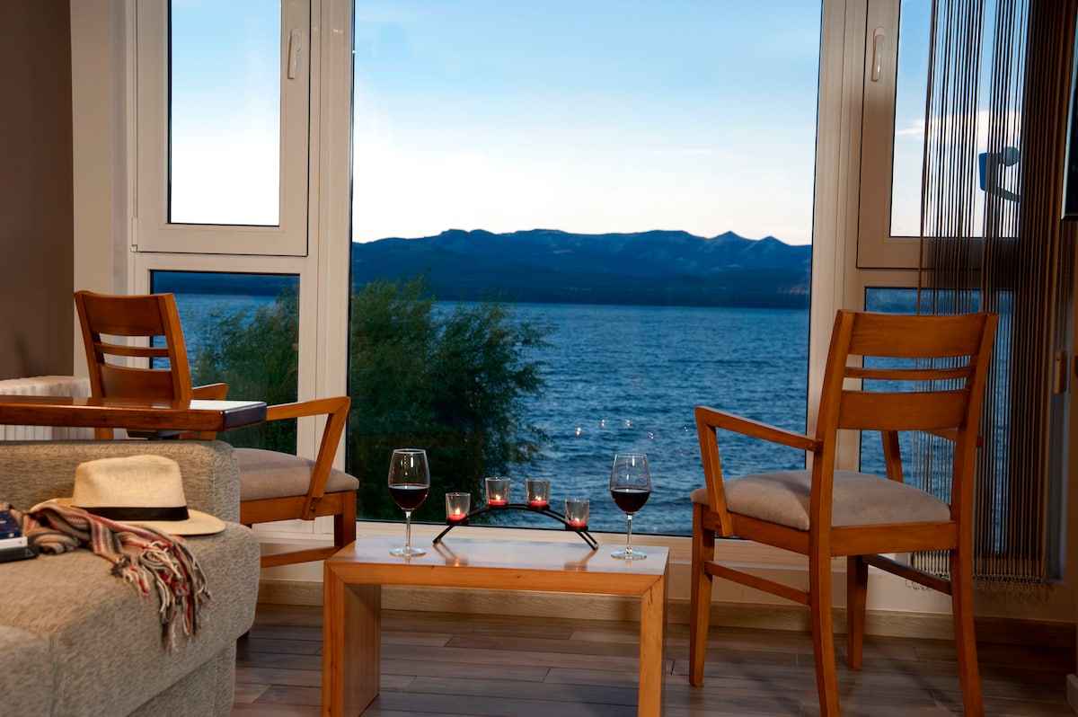 Este departamento, moderno, elegante y con gran espacio, es ideal para que tu viaje de a dos sea inolvidable! Podrás disfrutar de una amplia vista panorámica hacia el lago Nahuel Huapi y las montañas de fondo, con el cielo en todo su esplendor! Su estratégica ubicación, hace que estés a menos de 20 minutos del Aeropuerto, a poco más de 1 km de la Terminal de buses y del Centro, y a 200 metros del camino de la Costanera, desde donde apreciarás el imponente lago y las montañas. Te esperamos!!!