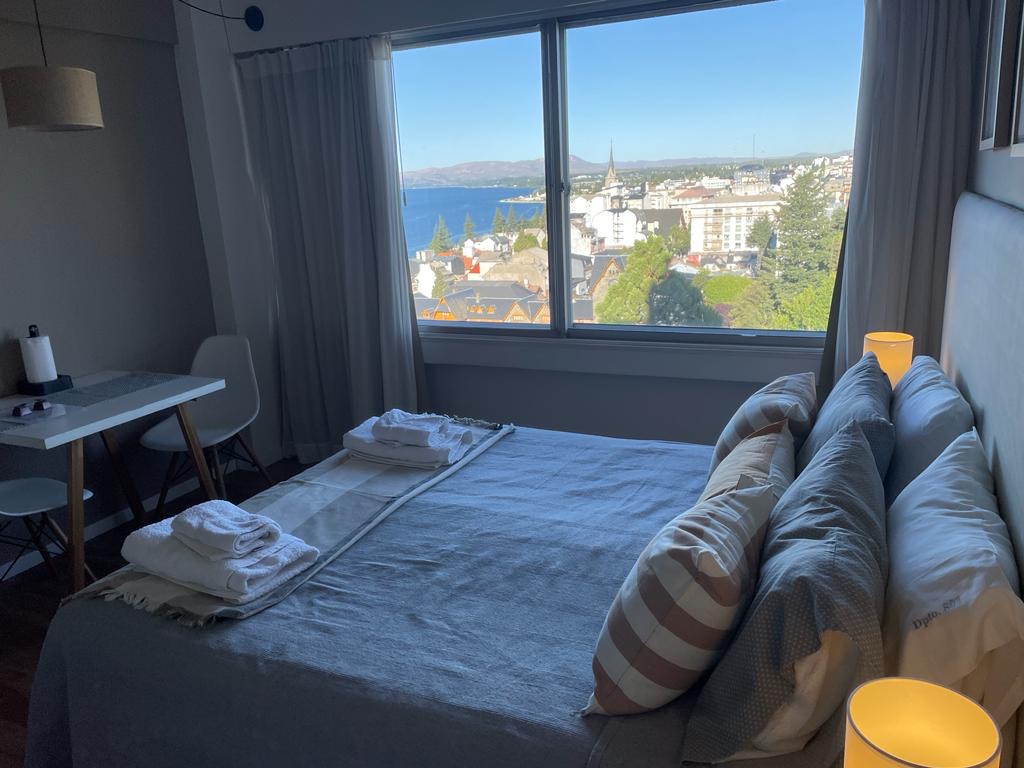 Monoambiente luminoso con vista al lago.Centrico Muy buena ubicación a 100mts de la Costanera y peatonal Para 2 personas, cuenta con 1cama Queen o con dos camas Twin. WIFI internet TV Smart 32” Android con conexión a internet. Vista lateral al lago Nahuel Huapi. Completamente quipado, tostadora, pava eléctrica, heladera, vajilla..Kiosco toallas y ropa de cama. Cuenta con Baño completo, secador pelo.Cerca del transporte publico y restoranet,confiterias,bares,chocolateras.