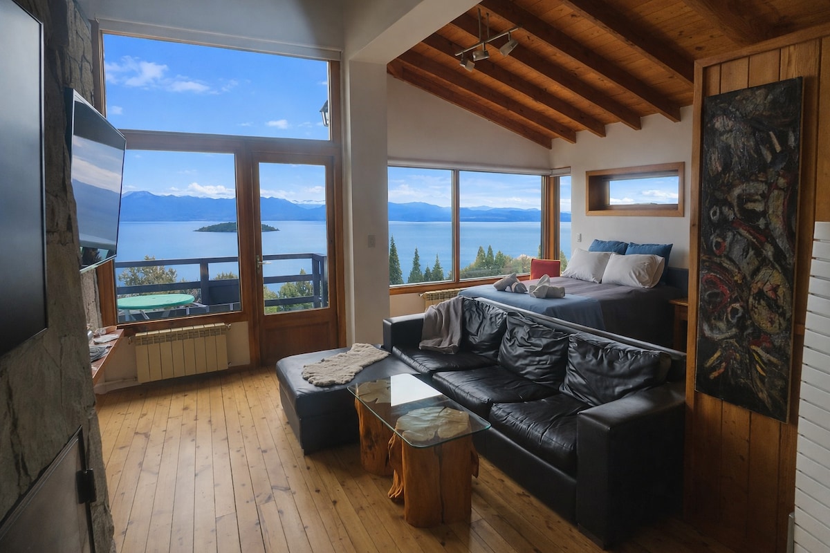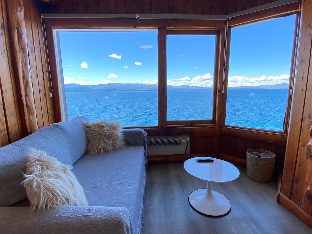 Disfruta de una estadía inolvidable en este cálido departamento monoambiente de 32 m2 ubicado sobre la costa del lago Nahuel Huapi, con las mejores vistas al lago y montañas. Acceso directo al lago. Deck con parrilla en el edificio. Estacionamiento. Ubicado frente a la parada de colectivo. Atención movilidad reducida: Es un tercer piso por escaleras. El hogar a leña es únicamente decorativo