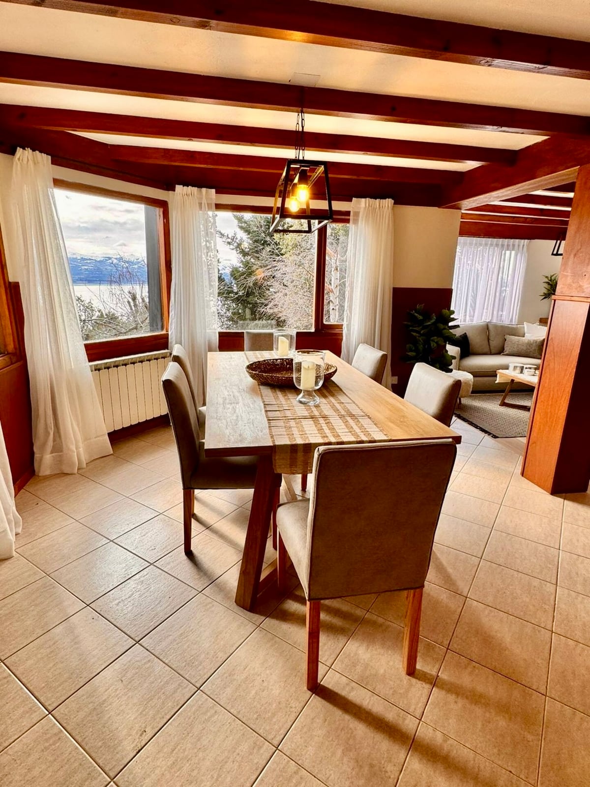 The charm of this house is immediately upon entering this modern space full of life, bathed in sun and light. The living room, dining room and fully equipped kitchen share a completely open space with stunning views of Lake Nahuel Huapi. The wooden deck is the perfect place to enjoy a magnificent patagonian sunset. THERE IS NO PROTECTION FOR BABIES/CHILDREN AT THE INTERIOR STAIRS AND BOTH EXTERIOR DECKS.