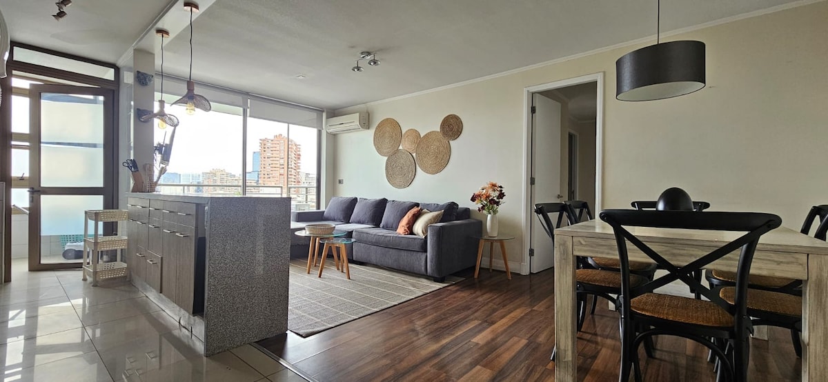 Depto 1 dormitorio, dos ambientes, amoblado, 1 sofá cama en salita, cocina americana El depto cuenta con Wifi/Fibra Optica, Tv Cable Smart Lavadora/Secadora Aire Acondicionado Ventanas Termopanel En edificio Gimnasio, sauna, piscina, quincho, sala de cine, Centro de lavado Está estrictamente prohibido fumar adentro del depto., de lo contrario tendrá que pagar una multa de Usd100 Opcional Solicitar 1 juego de sábanas para el futón, en reservas de dos huéspedes, tiene un costo de Usd30