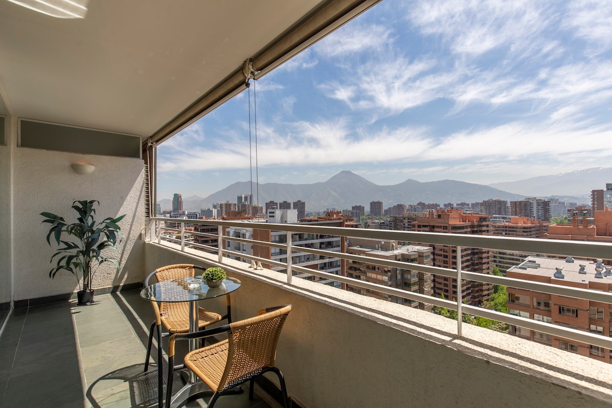 Acogedor departamento, ubicado en el mejor sector de Santiago. A sólo minutos de restaurantes, centros comerciales, zonas de interés turístico y agencias de ski. Espectacular vista a Los Andes Ubicado a 15 minutos caminando del mall Parque Arauco (1.5 km) y a 5 minutos caminando del metro Manquehue. ** Tv incluye app movistar y conexión a internet ** Sin malla de protección para niños ** Estacionamiento gratis en subterraneo del edificio (capacidad para un vehiculo)
