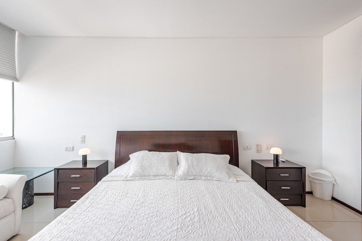 Disfruta de este lindo y tranquilo alojamiento que tiene excelente ubicación, se encuentra en un piso 5, es acogedor y cómodo, cuenta con todo lo que necesitas para estancias cortas o largas, tiene estacionamiento gratis en el sótano, entra mucha ventilación y luz, 2 aires acondicionados, edificio nuevo con zonas comunes y ascensor, el barrio es super tranquilo y hay un centro comercial, restaurantes y supermercados muy cerca. Ideal para recuperaciones por intervenciones médicas.