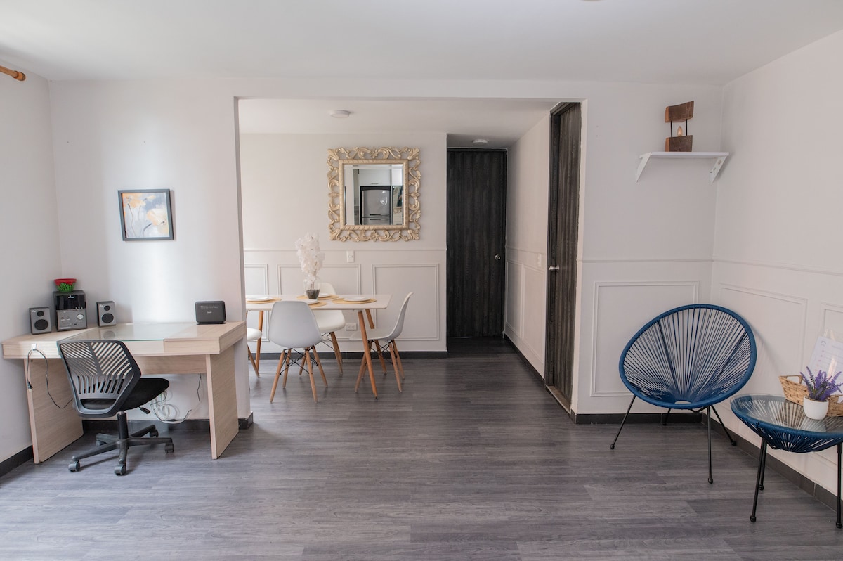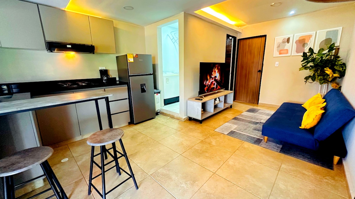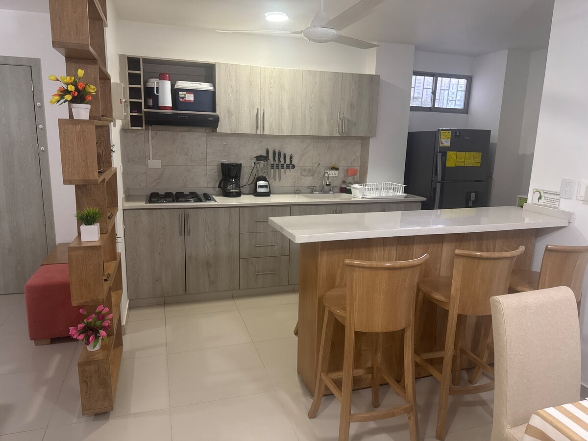 Hermoso apartaestudio, completamente independiente y completamente para el huesped, una cama doble, un sofacama, un baño, aire acondicionado, cocina completa y equipada, barra desayunadora, área de labores con lavadero, nevera, Internet, Televisor Smart, Tvcable, Netflix, Disney+, limpieza semanal gratuita para estancias largas si lo solicita.