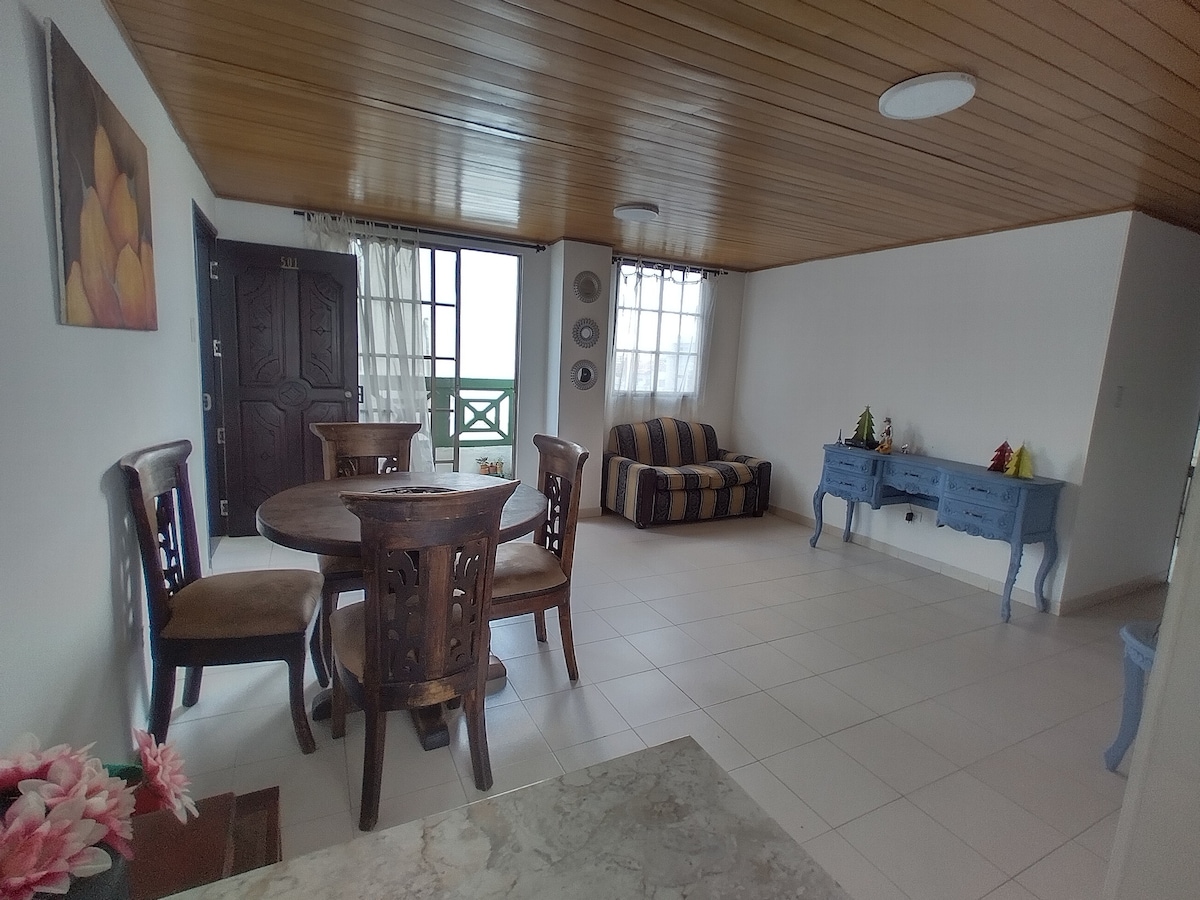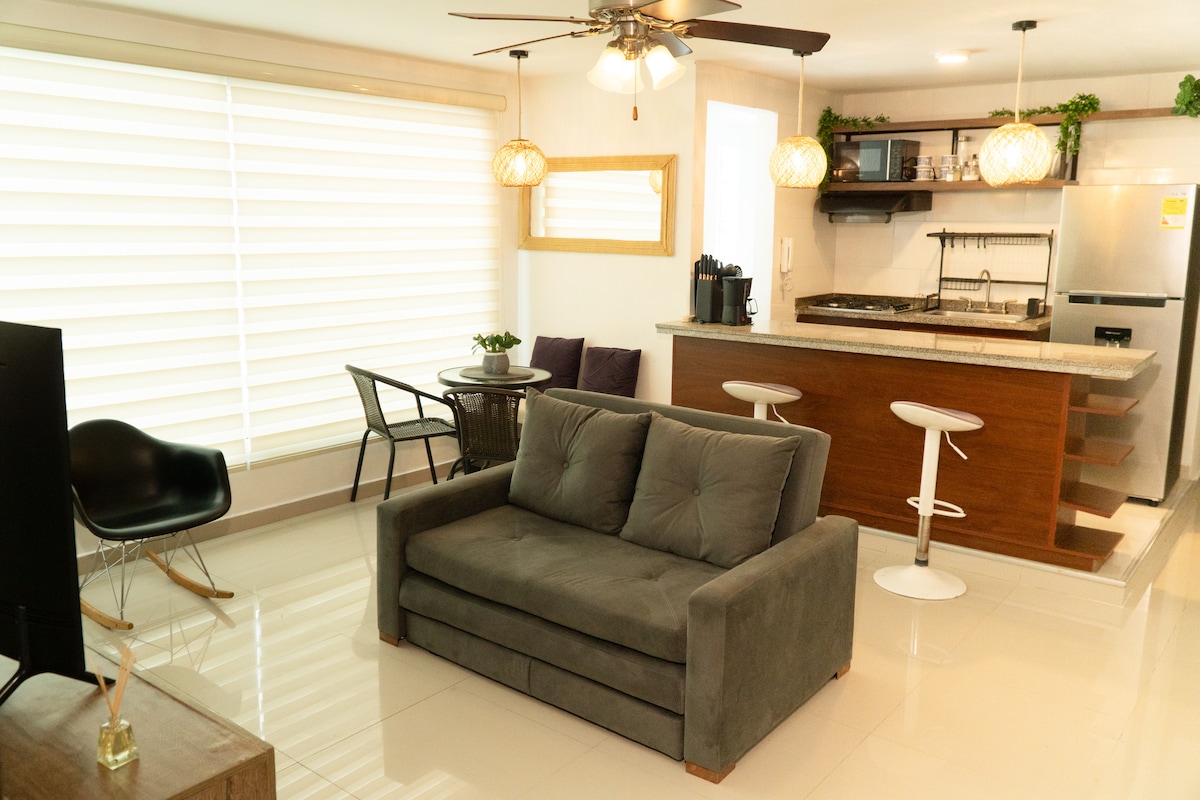 Disfruta de este lindo y tranquilo alojamiento que tiene excelente ubicación, se encuentra en un piso 5, es acogedor y cómodo, cuenta con todo lo que necesitas para estancias cortas o largas, tiene estacionamiento gratis en el sótano, entra mucha ventilación y luz, 2 aires acondicionados, edificio nuevo con zonas comunes y ascensor, el barrio es super tranquilo y hay un centro comercial, restaurantes y supermercados muy cerca. Ideal para recuperaciones por intervenciones médicas.